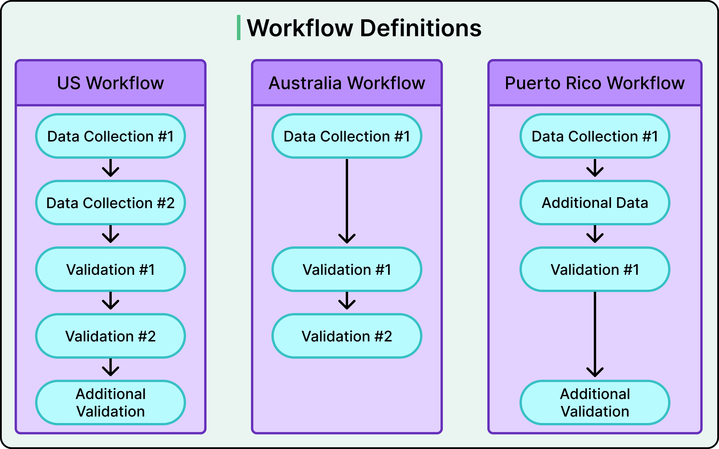 Workflow Definitions are the second layer. A workflow is simply an ordered list of steps for a specific market. The US workflow might look like Data Collection, followed by Identity Verification, followed by Compliance Check, followed by Additional Validation. Australia’s workflow skips one step and reorders another. Puerto Rico adds a regional customization. Each workflow is defined as a class with a list of step references, making it easy to see exactly what each market’s onboarding process looks like.