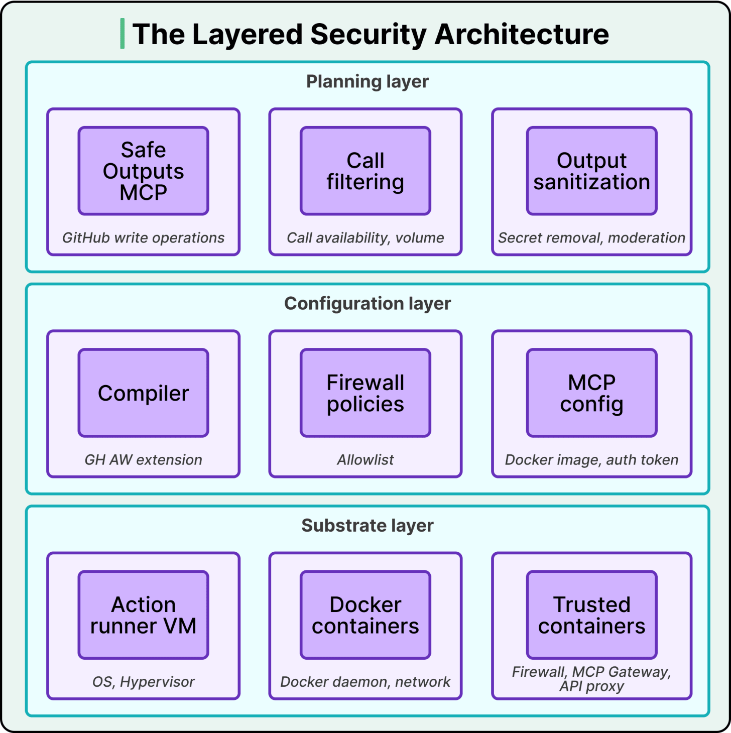 The substrate layer sits at the bottom. It’s built on a GitHub Actions runner VM and several Docker containers, including a set of trusted containers that mediate privileged operations. This layer provides isolation between components, controls system calls, and enforces kernel-level communication boundaries. These protections hold even if an untrusted component is fully compromised and executes arbitrary code within its container. The substrate doesn’t rely on the agent behaving correctly, and even arbitrary code execution inside the agent’s container hits a wall at this level.