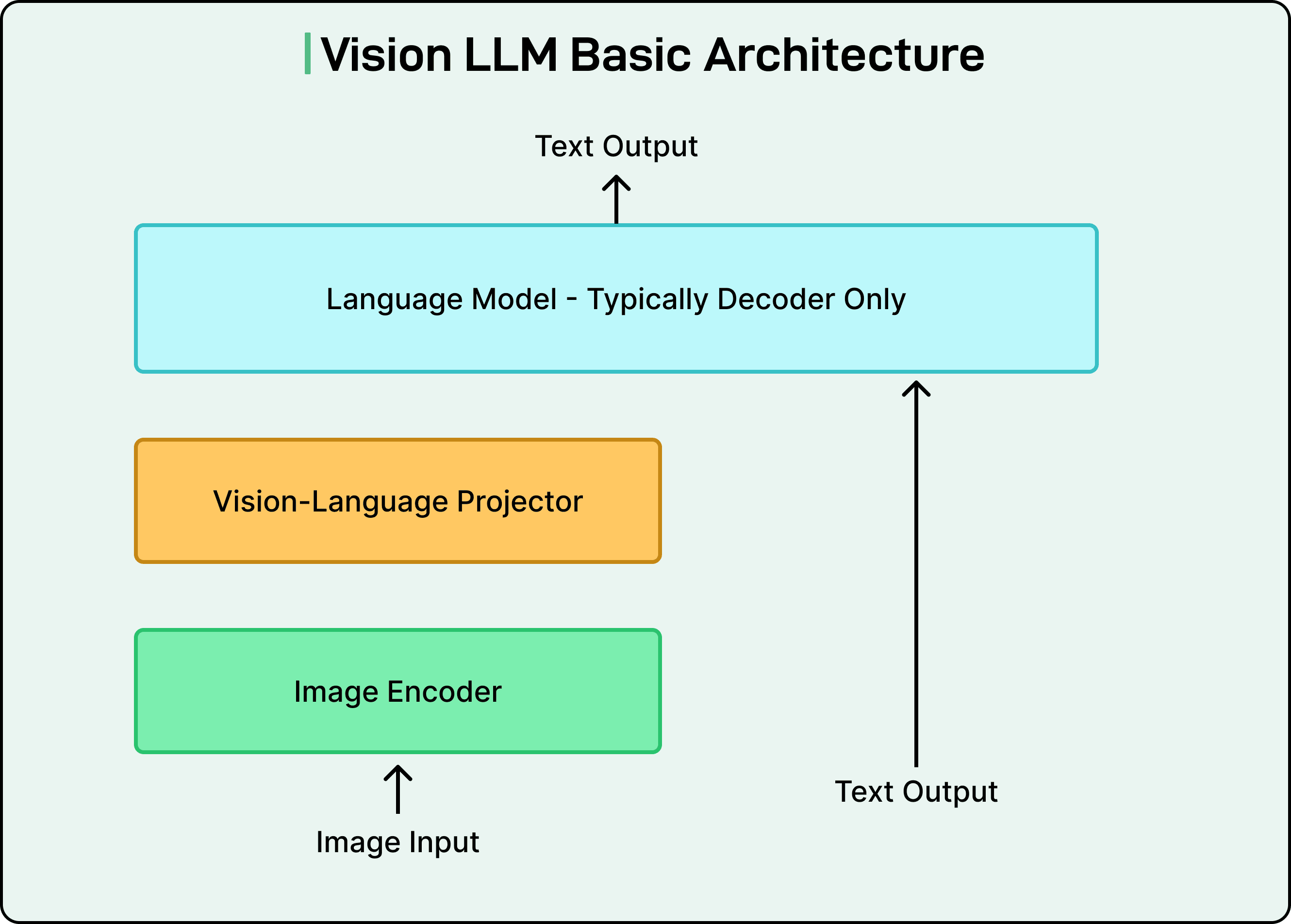A standard LLM processes text inputs and generates text outputs. A Vision LLM extends this capability by enabling the model to understand and process images. The architecture consists of three essential components working together: