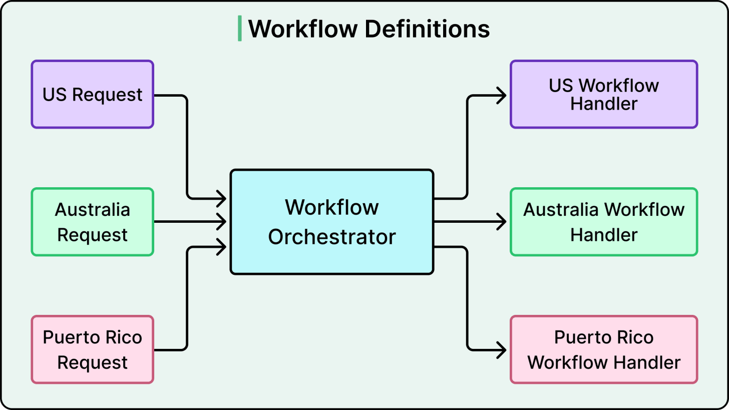 The Orchestrator sits at the top. It’s a lightweight routing layer that looks at context (which country and which market type) and decides which workflow definition should handle the request. That’s all it does. It doesn’t execute steps or manage state. It doesn’t contain business logic either. The main insight here is that the smartest thing about the orchestrator is how little it does. Developers tend to imagine the central controller as the brain of the system. However, in this architecture, the brain is distributed, and the orchestrator is just a traffic cop.
