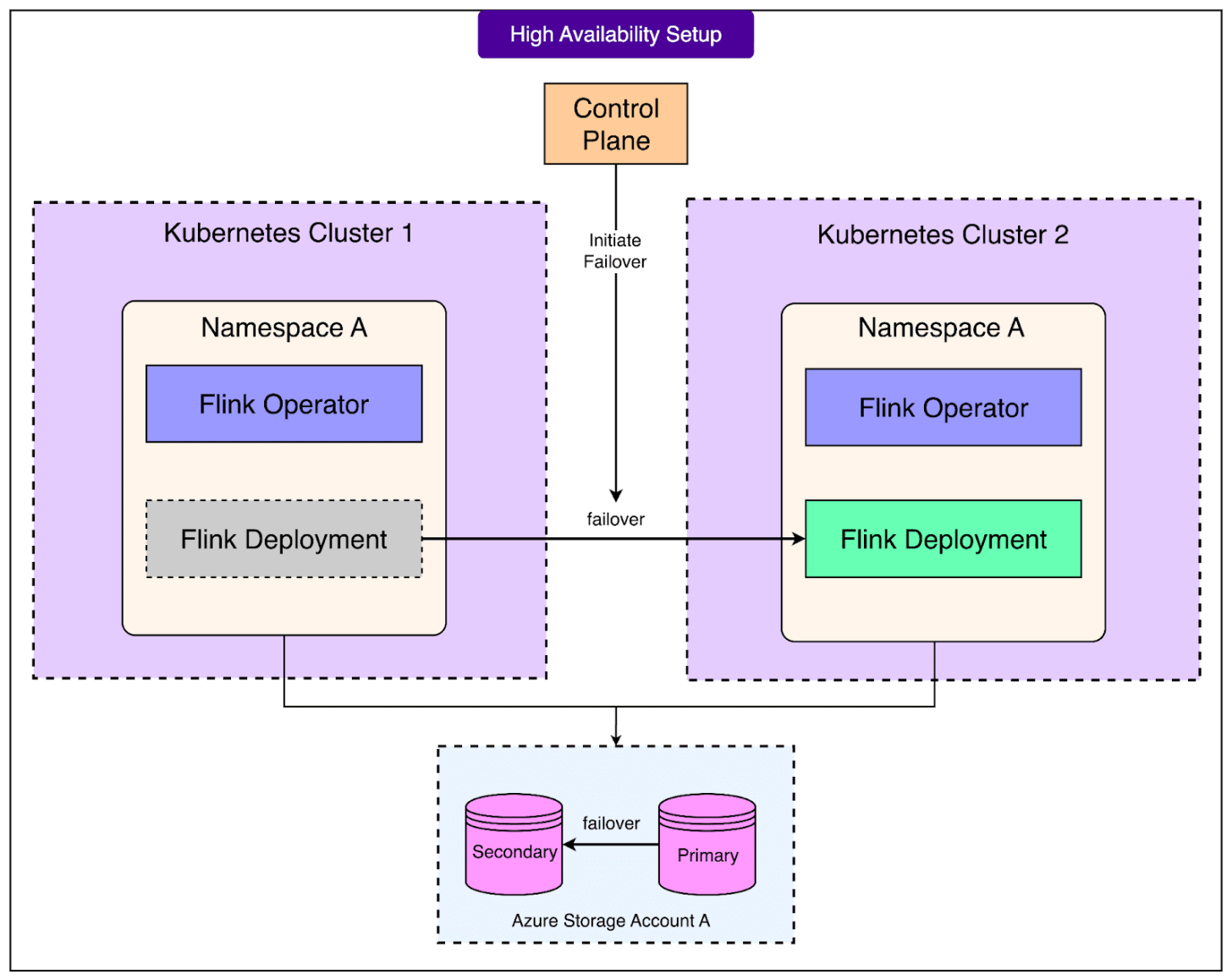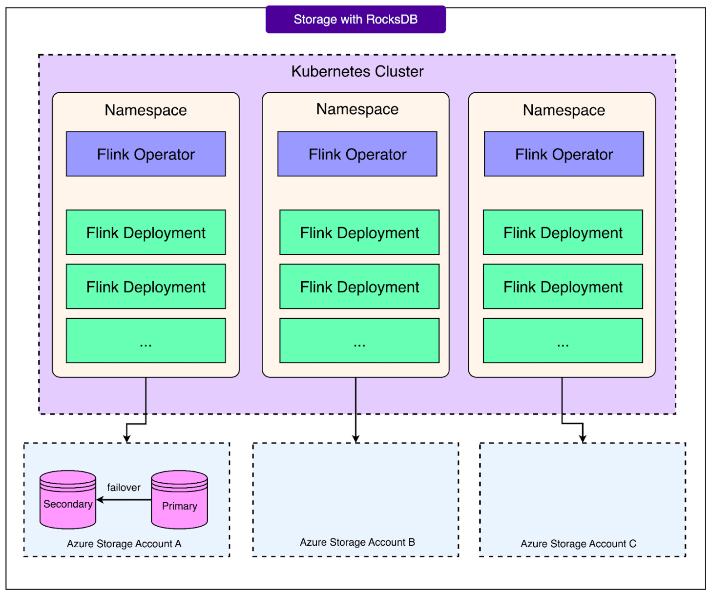 A key enabler of this design is decoupled state and HA storage. The state of a Flink job (the memory of what it has processed so far) is not tied to any single cluster. Instead, it is stored in separate, highly available blob storage accounts. Because of this separation, a pipeline can recover its state and continue processing even if it has to move between clusters.