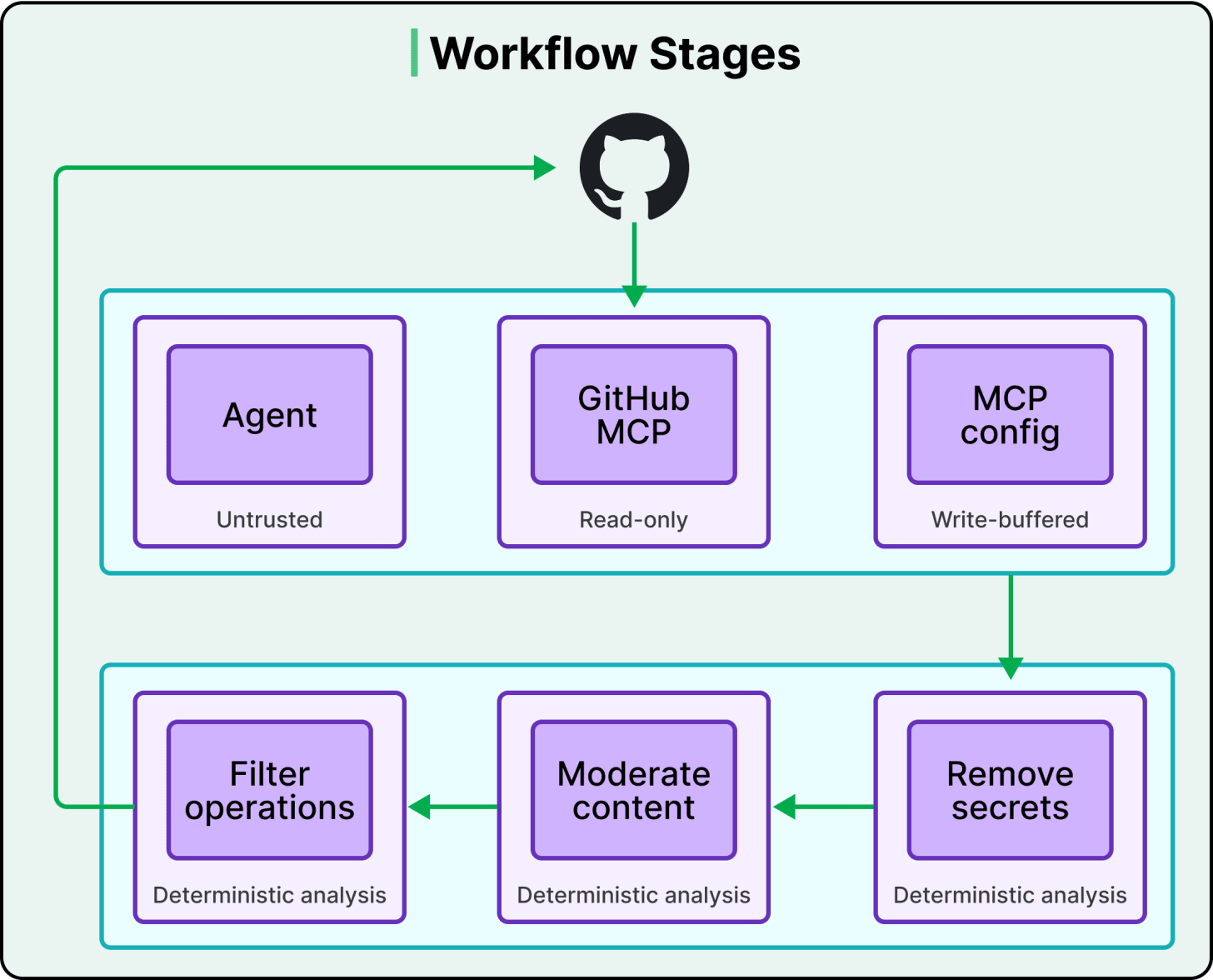 The agent can read GitHub state through the GitHub MCP server, which operates in read-only mode. But it cannot write to GitHub directly. All write operations go through a separate safe output MCP server, which only buffers the agent’s intended changes without executing them.
