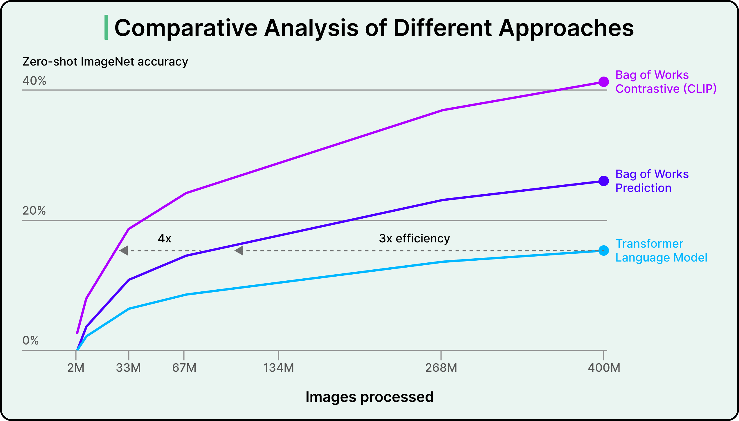 First, they chose contrastive learning over the more obvious approach of training the model to generate image captions. Early experiments tried teaching systems to look at images and produce full text descriptions word by word, similar to how language models generate text. While intuitive, this approach proved incredibly slow and computationally expensive. Generating entire sentences requires much more computation than simply learning to match images with text. Contrastive learning turned out to be 4 to 10 times more efficient for achieving good zero-shot performance.