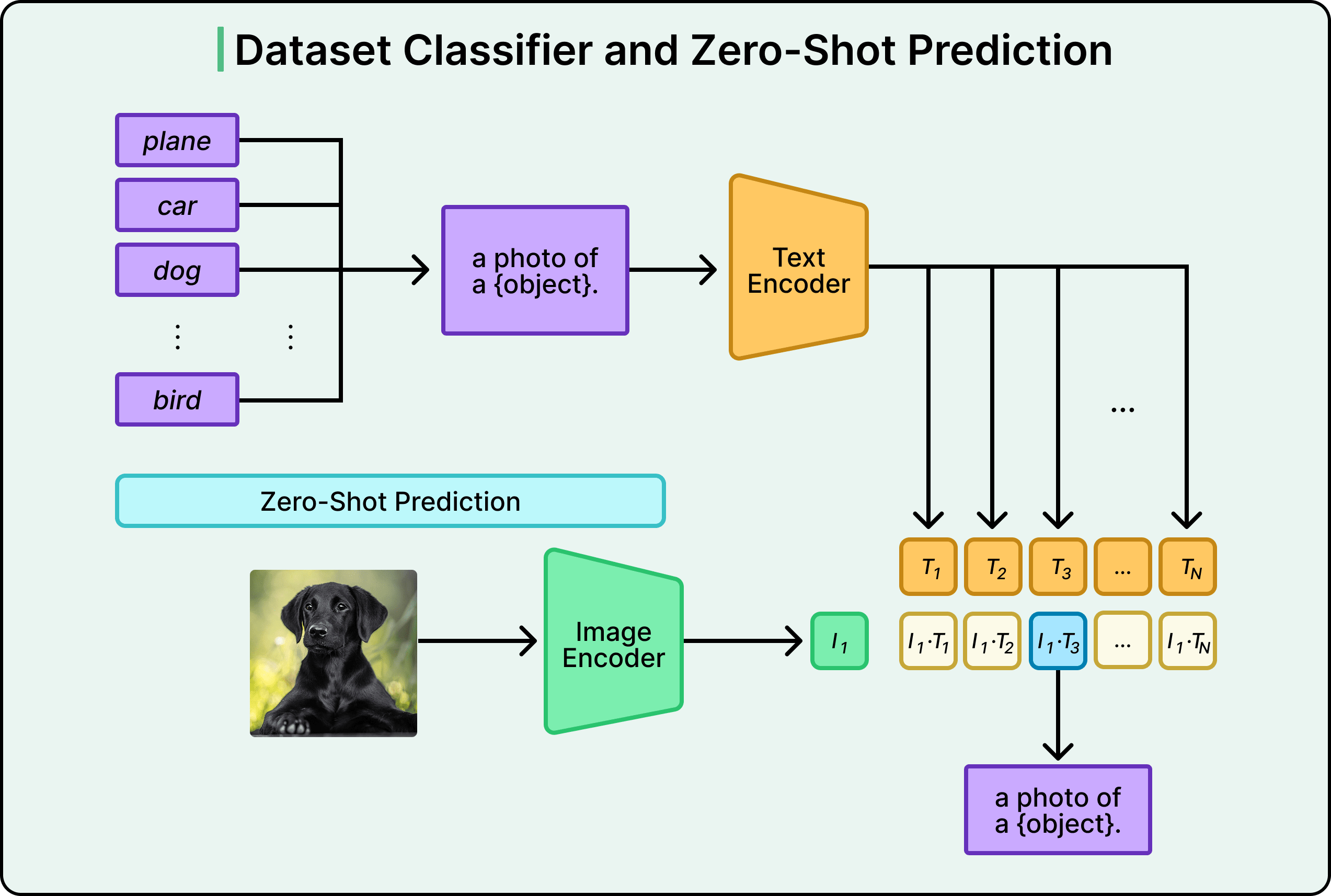 Instead, we can simply take the image and pass it through the image encoder to get an embedding. Next, we can take the text “a photo of a dog” and pass it through the text encoder to get another embedding. Further on, we can take the text “a photo of a cat” and get a third embedding. Compare which text embedding is closer to the image embedding, which would be the answer.