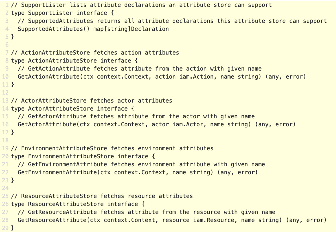 Each attribute store must implement a SupportedAttributes() function that declares which attributes it can provide. This enables the authorization engine to pre-compile condition expressions and validate that all required attributes are available. At runtime, when an attribute value is needed, the engine calls the appropriate method on the corresponding store.