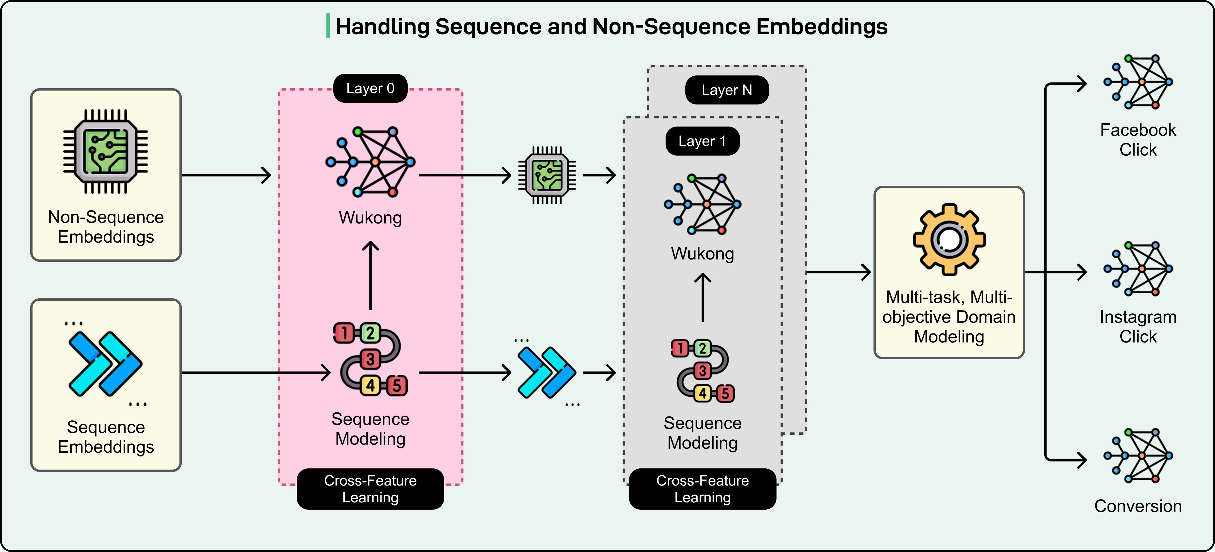 GEM uses an enhanced version of the Wukong architecture with stackable factorization machines that can scale both vertically for deeper interactions and horizontally for broader feature coverage. This architecture works through multiple stacked layers, where each successive layer learns increasingly complex patterns from the simpler patterns discovered by previous layers. For instance, an early layer might discover the basic pattern that young professionals respond well to tech product ads. A layer deeper in the stack builds on this by learning that young professionals in urban areas who show interest in fitness respond especially well to smart wearable ads. An even deeper layer might refine this further, discovering that this combination works best specifically when those ads emphasize data tracking features rather than fashion elements.