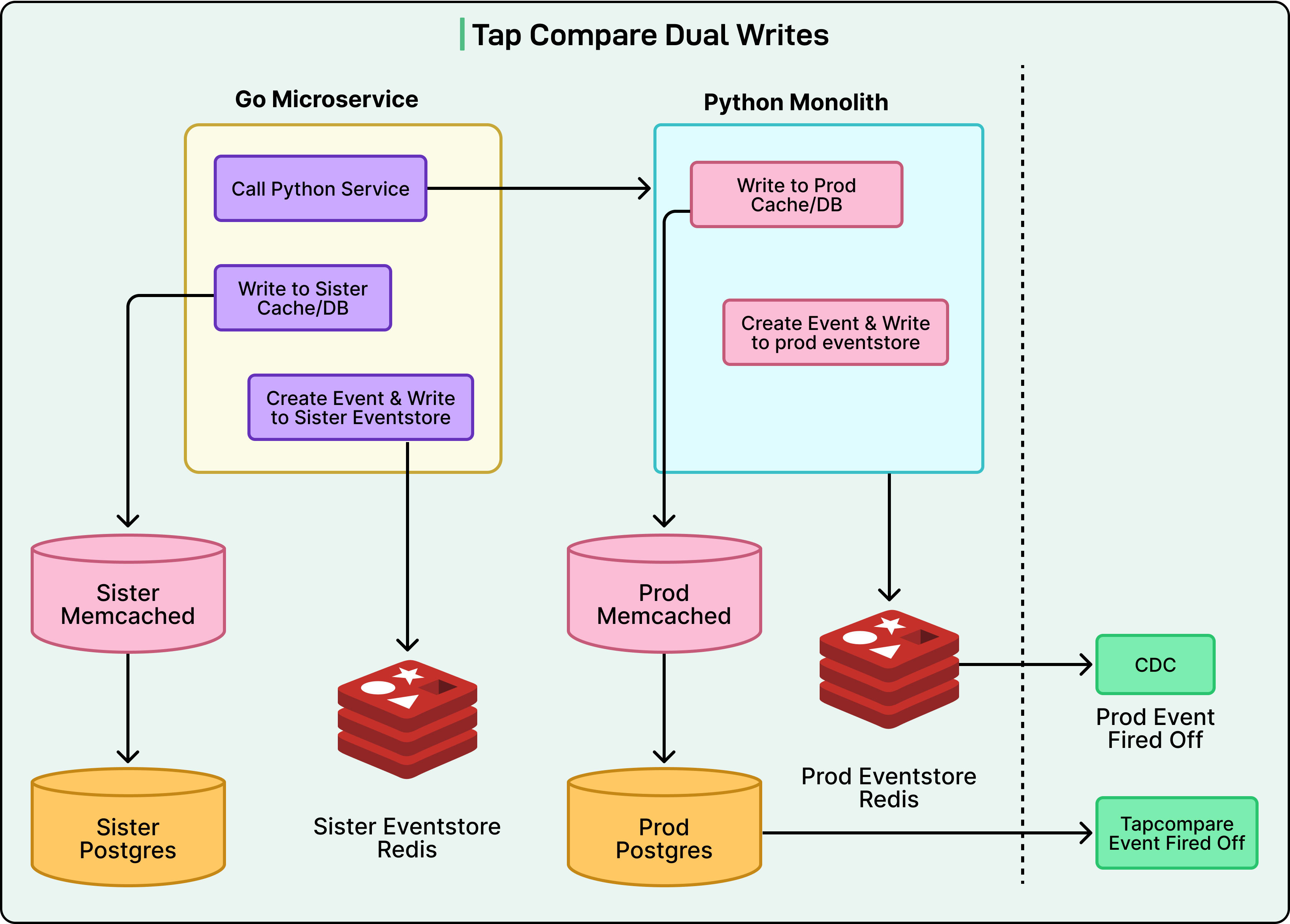 Reddit’s engineering team came up with a solution they called “sister datastores”. They created three completely separate datastores that mirrored their production infrastructure (Postgres, Memcached, and Redis). The critical difference was that only the new Go microservice would write to these sister stores.