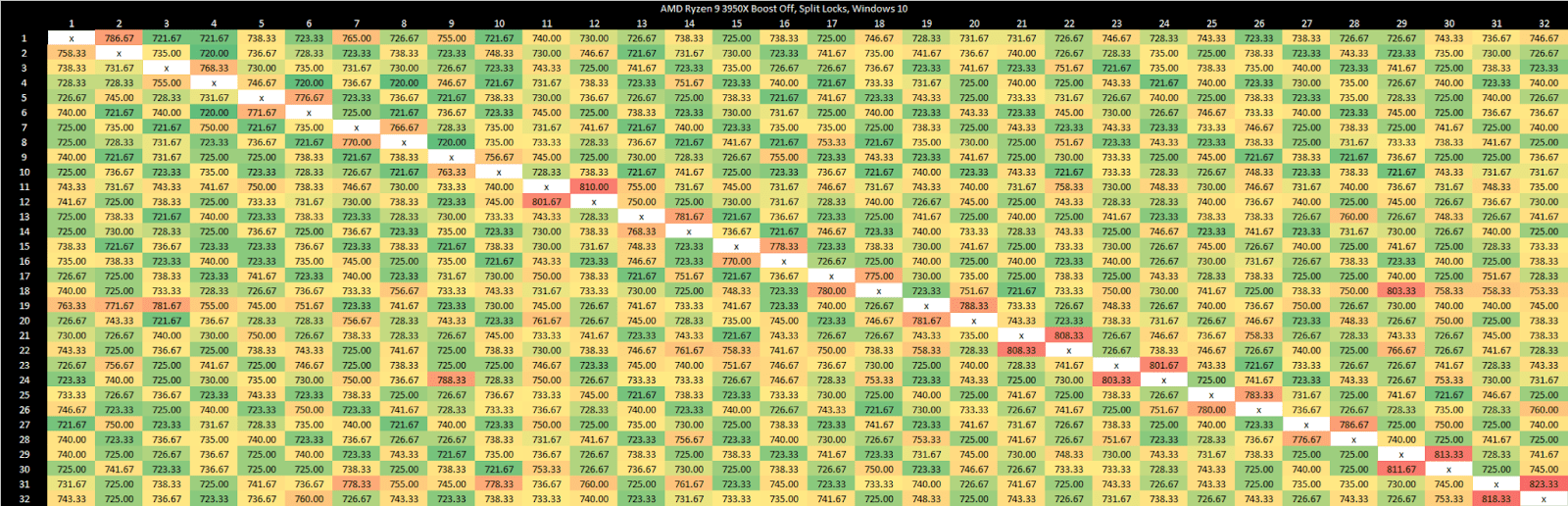 Testing on Linux without touching sysctl settings shows latency comparable to mechanical hard drive seek time, which is an eternity for a CPU. This kind of delay should also eliminate the noisy neighbor effects above, since the split lock core to core latency test simply isn’t running most of the time.