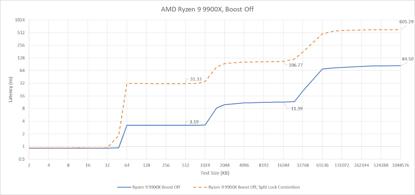 To assess the potential disruption from split locks, I ran memory latency and bandwidth microbenchmarks on cores excluded from the core to core latency test. Besides microbenchmarks, I ran Geekbench 6’s photo filter and asset compression workloads. The photo filter workload generates a lot of cache miss traffic, while asset compression tends to be the opposite. Many recent CPUs only achieve their highest clock speeds with two or fewer cores active. One core will be loaded by the workload being tested for contention effects, and another pair will be used for the core to core latency test. I therefore turned off boost or lowered clock speeds on some of the tested hardware to reduce noisy neighbor effects from clock speed variation, helping isolate the effects of split locks.