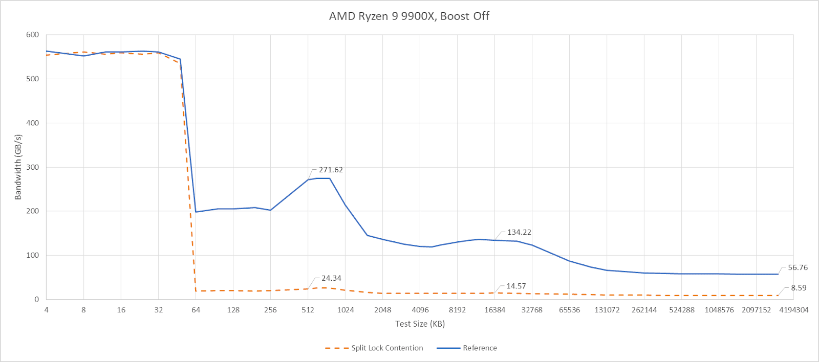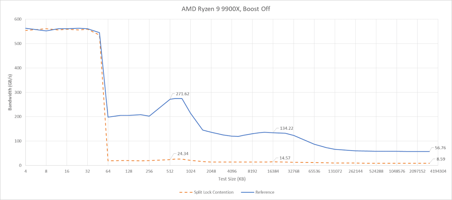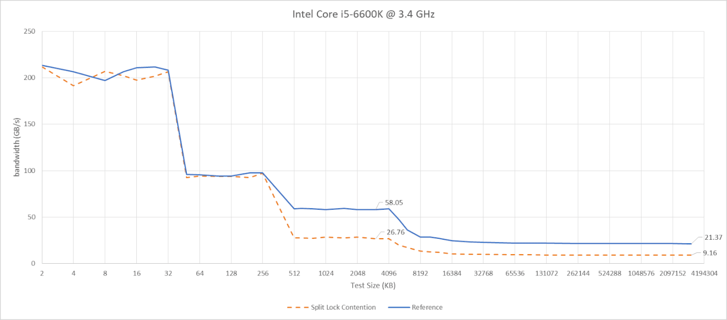 Split locks don’t affect cache hits. Remarkably, that extends to the shared L3 cache. DRAM performance does get hit, with latency doubled and bandwidth cut by more than half.