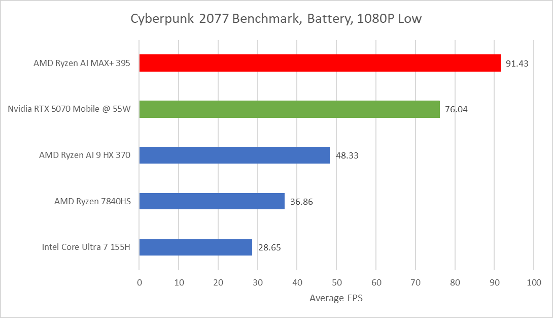 Switching to gaming workloads with Cyberpunk 2077, we start with a benchmark conducted while on battery power. The gap with other iGPU’s is still wide, but now the 5070M is limited to 55W and exhibits 7.5% worse performance at 1080p low settings when compared to the Radeon 8060S.