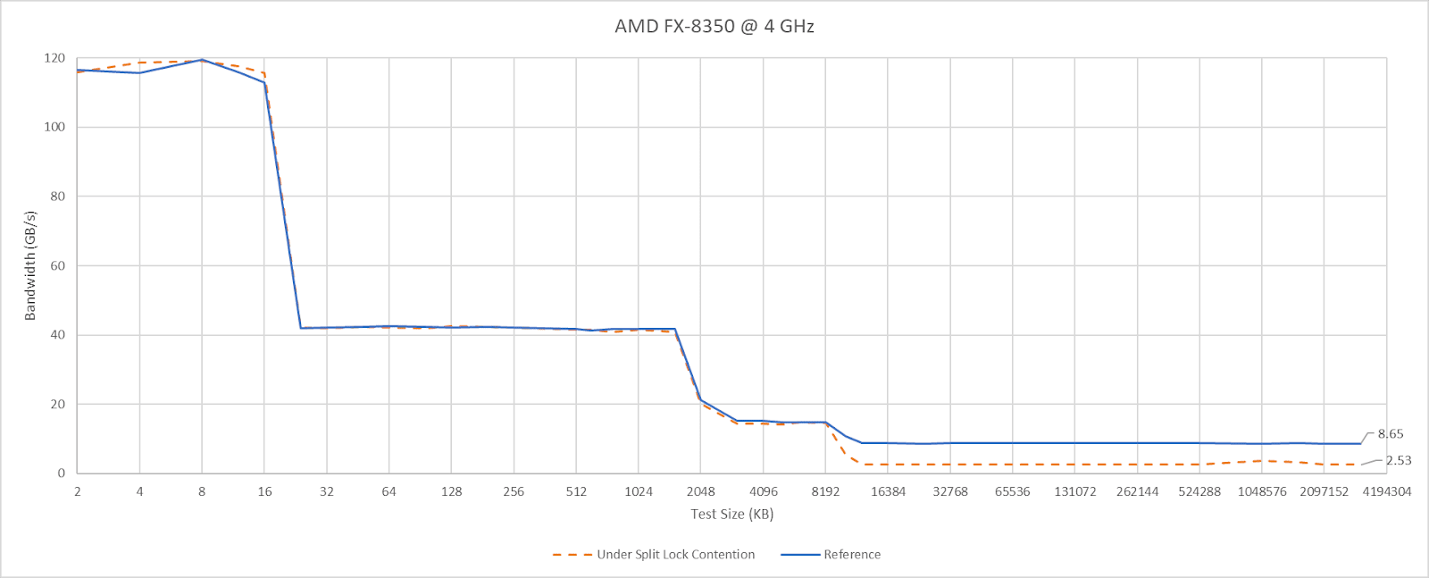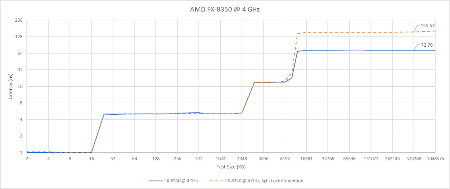 Piledriver also throws a wrench into the works when trying to define bus locks. Maybe AMD’s old architecture doesn’t use bus locks at all, and is able to use its cache coherency protocol to let unrelated accesses proceed as long as they hit cache.