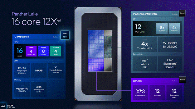 Starting with the smallest Panther Lake configuration, we have 4 P-Cores and 4 LP E-Cores paired with 8MB Memory-side Cache on the Compute Tile which is fabricated on Intel’s newest node 18A. That Compute Tile is paired with a 4 core Xe3 iGPU fabricated on Intel’s 3 process which makes this the first Intel Arc product fabricated at Intel. The Platform Controller Tile has 12 PCIe lanes split between 4 Gen 5 lanes and 8 Gen 4 lanes along with 4 Thunderbolt 4 controllers, 2 USB 3.2 & 8 USB 2.0 ports, and Wi-Fi 7 and Bluetooth 6.0.