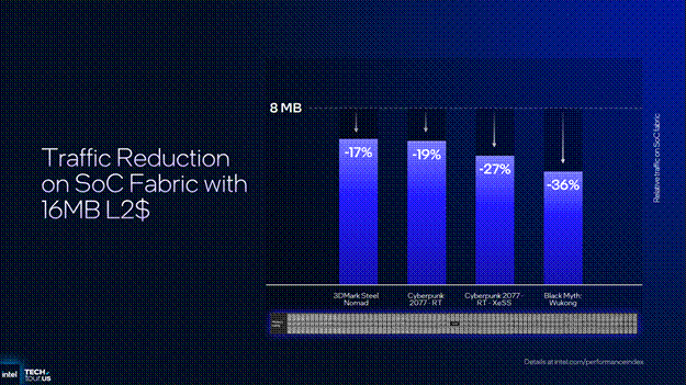The 16MB L2 found in the 12Xe GPU reduces the traffic on the SoC fabric by up to 36% depending on the workload in question compared to a 8MB L2.