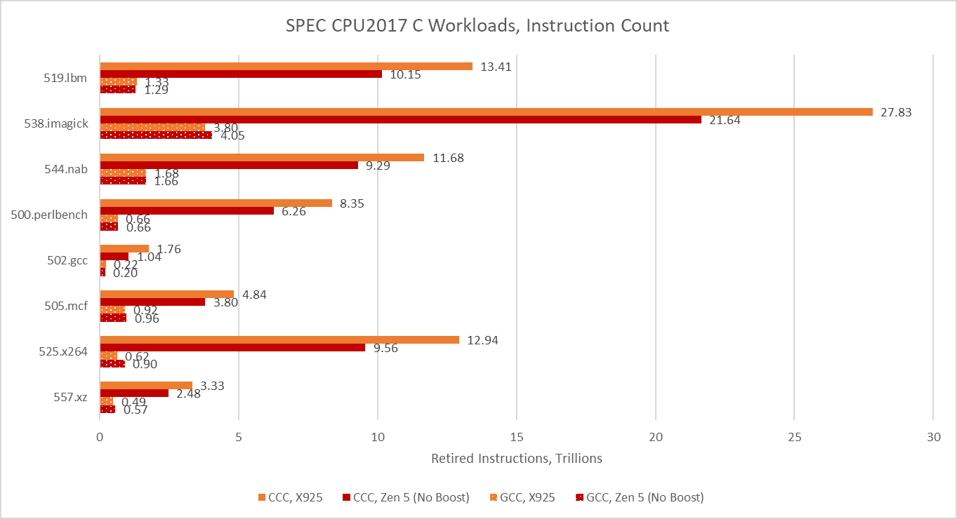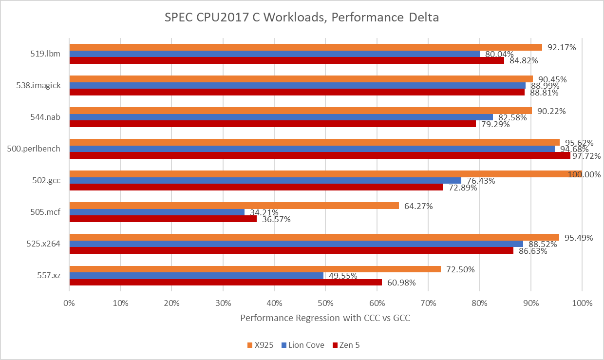 Arm’s Cortex X925 suffers hardest from the CCC switch. With GCC, Arm’s core was very much a match for Zen 5 and Lion Cove. Now, it loses in every workload except for 500.perlbench, where Zen 5 takes a dive to let X925 slip ahead. But X925 still can’t compare to Lion Cove in that workload.
