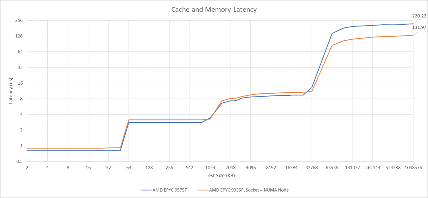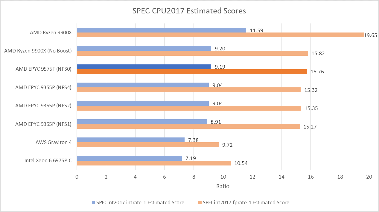 Higher memory latency could lead to lower performance, especially in single threaded workloads. But the EPYC 9575F does surprisingly well in SPEC CPU2017. The EPYC 9575F runs at a higher 5 GHz clock speed, and DRAM latency is only one of many factors that affect CPU performance.
