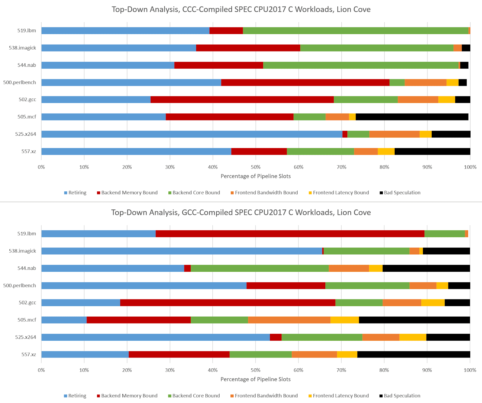 CCC challenges Lion Cove’s pipeline in a similar fashion, though Lion Cove is generally more backend bound than Zen 5. This could be because Lion Cove sits atop a higher latency uncore. Or, the difference could be down to accounting methodology. For example, Intel might be counting cycles where any instruction is delayed by a load as “memory bound”, which could lead to higher counts than AMD’s approach. Lion Cove’s 8-wide decoder excels in 500.perlbench, where frontend limitations are minor compared to what they were in Zen 5.