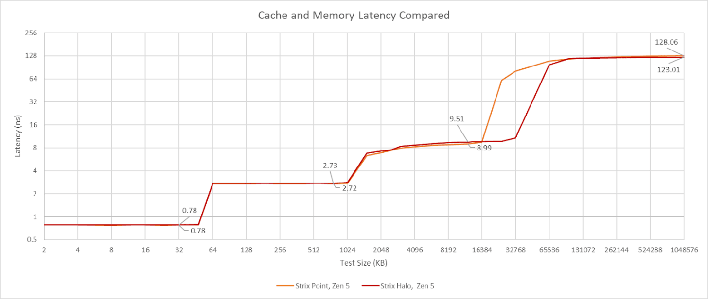 Starting with the memory latency from Zen 5’s perspective, we see that the latency difference between Strix Point and Strix Halo is negligible with Strix Point at ~128ns of memory latency and Strix Halo at ~123ns of memory latency. However, as you can see the CPU does not have access to the 32MB of Infinity Cache on the IO die. This behavior was confirmed by Mahesh Subramony during our interview about Strix Halo at CES 2025.