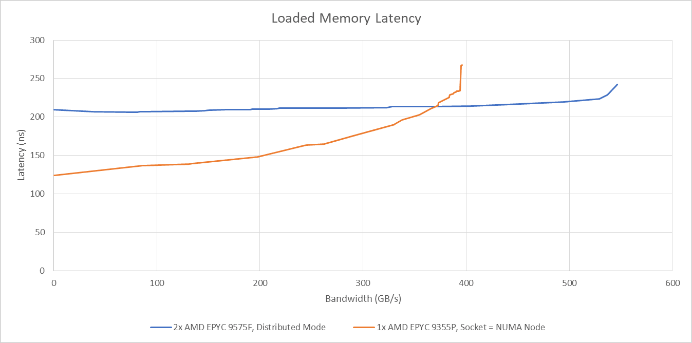 NPS0 mode does have a bandwidth advantage from bringing twice as many memory controllers into play. But the extra bandwidth doesn’t translate to a latency advantage until bandwidth demands reach nearly 400 GB/s. The EPYC 9355P seems to suffer when a latency test thread is mixed with bandwidth heavy ones. A bandwidth test thread with just linear read patterns can achieve 479 GB/s in NPS1 mode. However, my bandwidth test produces low values on the EPYC 9575F because not all test threads finish at the same time. I avoid this problem in the loaded memory latency test, because I have bandwidth load threads check a flag. That lets me stop all threads at approximately the same time.