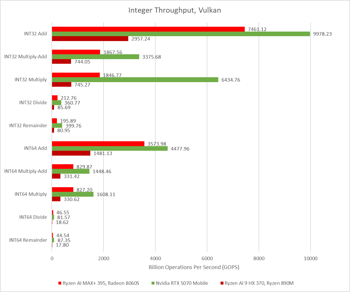 Moving to the integer throughput and we see the 5070 Mobile soundly pulling ahead of the Radeon 8060S.