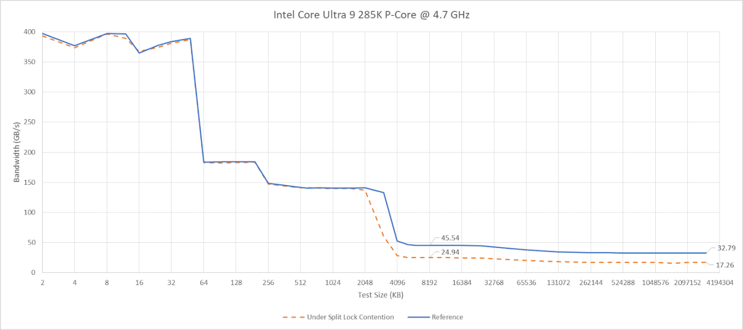 On Arrow Lake, split locks only affect L2 misses. It’s close to a “bus lock” in the traditional sense because it affects the first level in the memory hierarchy shared by all CPU cores. In theory a program can be completely unaffected by split locks as long as it keeps hitting in L2 or faster caches.