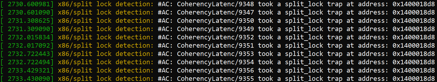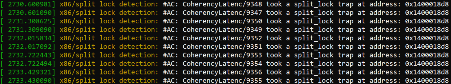 Bus locks are problematic because they’re slow, and taking a bus lock “potentially disrupts performance on other cores and brings the whole system to its knees”. AMD and Intel’s newer cores can trap split locks, letting the kernel easily detect processes that use split locks and potentially mitigate that noisy neighbor effect. Linux defaults to using this feature and inserting an artificial delay to mitigate the performance impact.