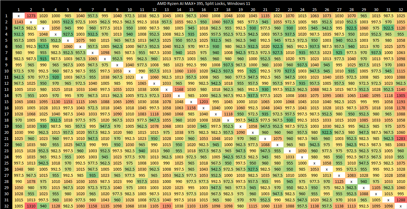 Zen 5 in the Ryzen AI MAX+ 395 (Strix Halo) has higher split lock latency than its desktop Zen 5 counterparts. I suspect split locks are handled at Infinity Fabric’s Coherent Station blocks, but curiously those counters also increment for intra-cacheline locks that are handled within a CCX. Perhaps the Coherent Station gets some sort of notification about a line changing state.