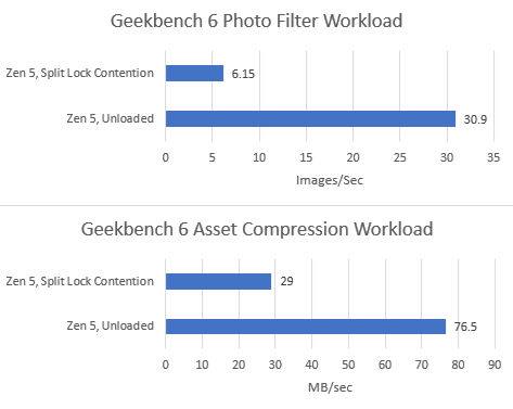 Both Geekbench 6 workloads take heavy performance regressions under split lock contention. Asset Compression doesn’t generate a lot of L3 miss traffic, but even a L1D miss is very costly with split locks being looped on Zen 5.