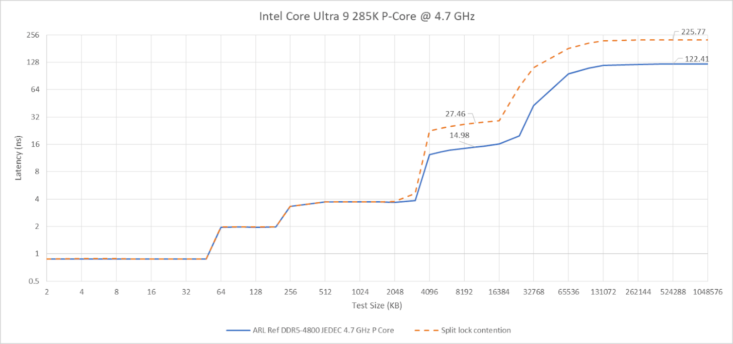 Split locks trash everything beyond L1D. L2 and L3 performance regresses by a factor of ten. Zen 5 suffers severe penalties from split locks compared to Arrow Lake, though this situation is certainly a very contrived and unrealistic one.