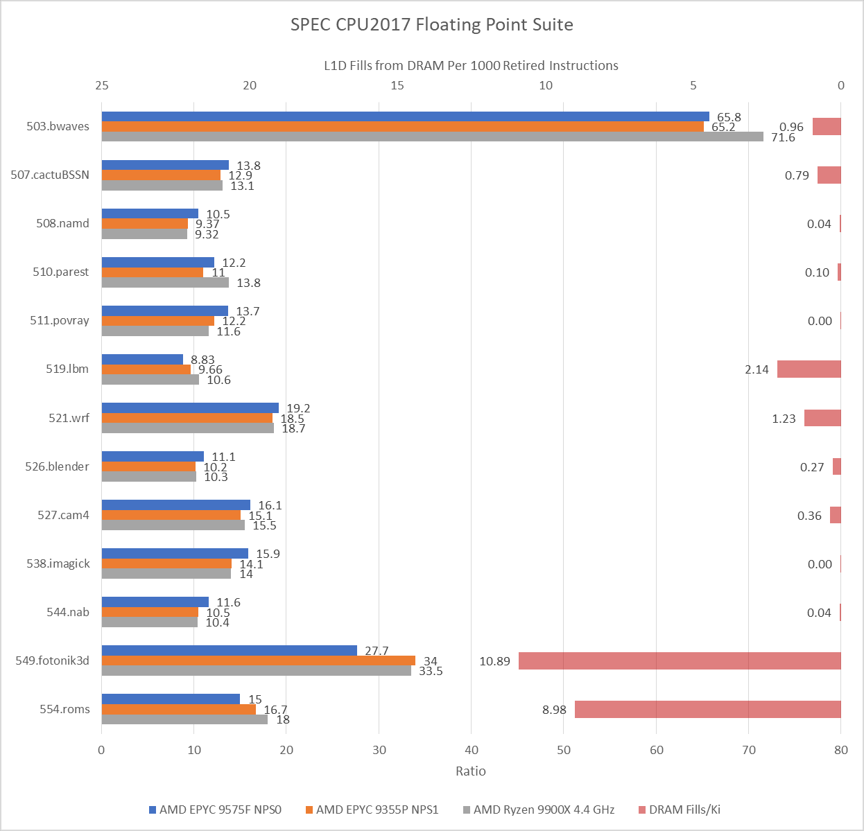 SPEC CPU2017’s floating point suite also shows diverse behavior. 549.fotonik3d and 554.roms suffer in NPS0 mode as the EPYC 9575F struggles to keep itself fed. 538.imagick plays nicely to the EPYC 9575F’s advantages. In that test, high cache hitrates let the 9575F’s higher core throughput shine through.