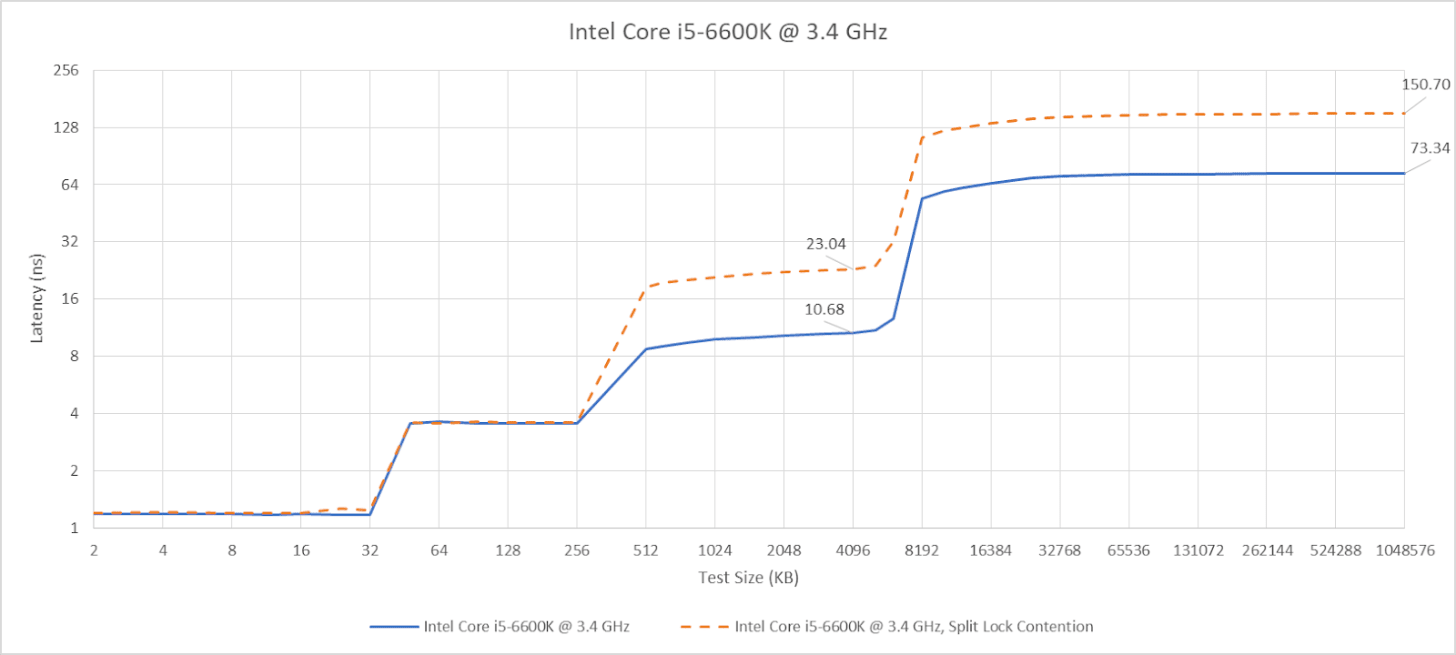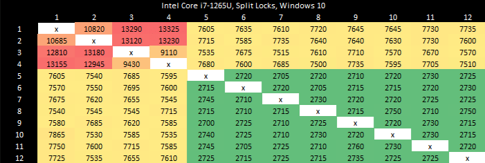 I have a core to core latency test that bounces an incrementing counter between cores using _InterlockedCompareExchange64. That compiles to lock cmpxchg on x86-64, which is an atomic test and set operation. I normally target a value at the start of a 64B aligned block of memory, but here I’m modifying it to push the targeted value’s start address to just before the end of the cache line. Doing so places some bytes of the targeted 8B (64-bit) value on the first cache line, and the rest on the next one. As expected, “core to core latency” with split locks range from bad to horrifying.