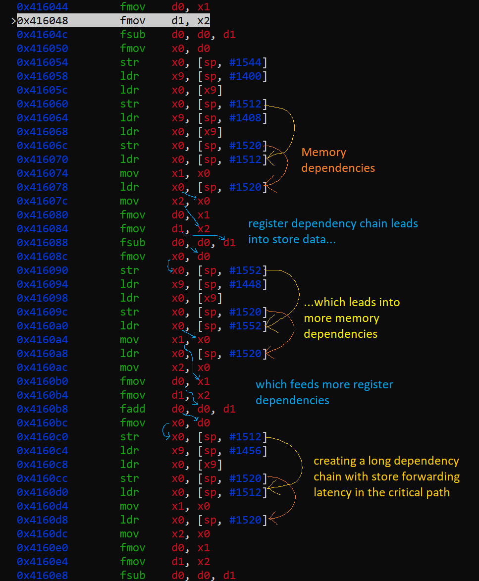 CCC doesn’t stop there and exceeds quotas by decomposing current = A[current] into a nine instruction dependency chain. On x86-64, it shuffles the index through several registers and sends it on a trip through the stack. It does the same on aarch64, but at least keeps the index in registers. On both architectures, CCC brings the array base address in from the stack, and sends it on another round trip through the stack for good measure before using it.