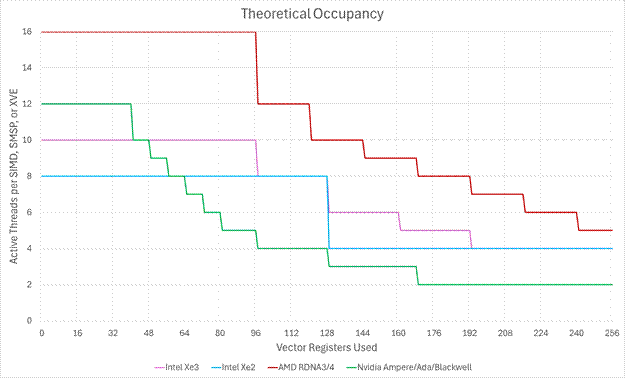 In Xe1 and prior Intel GPUs, a thread would be allocated 128 registers regardless of if that thread needed all 128 registers or not. In Xe2, Intel added the “Large GRF” mode which allows a thread to pick between 128 registers or 256 registers. Xe3 now allows a thread to allocate up to 256 registers in 32 register increments.
