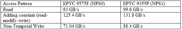 Per-CCD bandwidth is barely affected by the different NPS modes. Both the EPYC 9355P and 9575F use “GMI-Wide” links for their Core Complex Dies, or CCDs. GMI-Wide provides 64B/cycle of read and write bandwidth at the Infinity Fabric clock. On both chips, each CCD enjoys more bandwidth to the system compared to standard “GMI-Narrow” configurations. For reference, a GMI-Narrow setup running at a typical desktop 2 GHz FCLK would be limited to 64 GB/s of read and 32 GB/s of write bandwidth.
