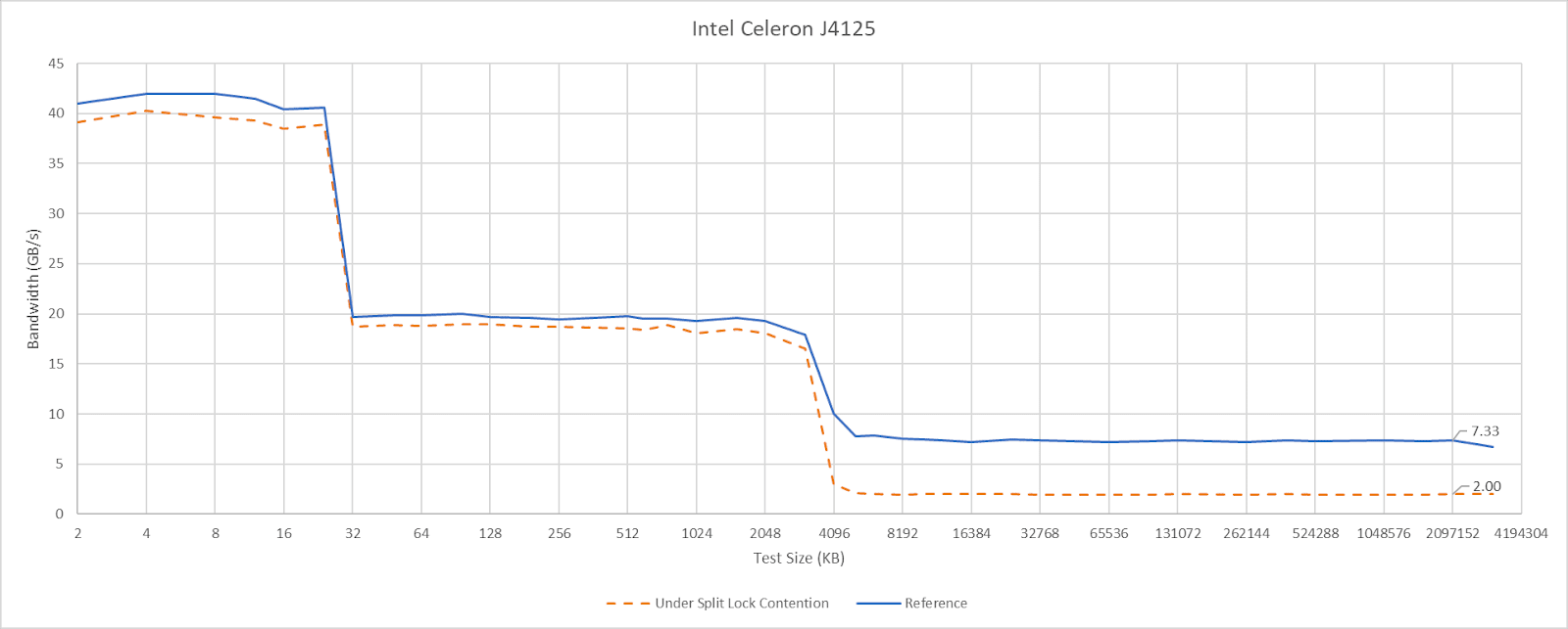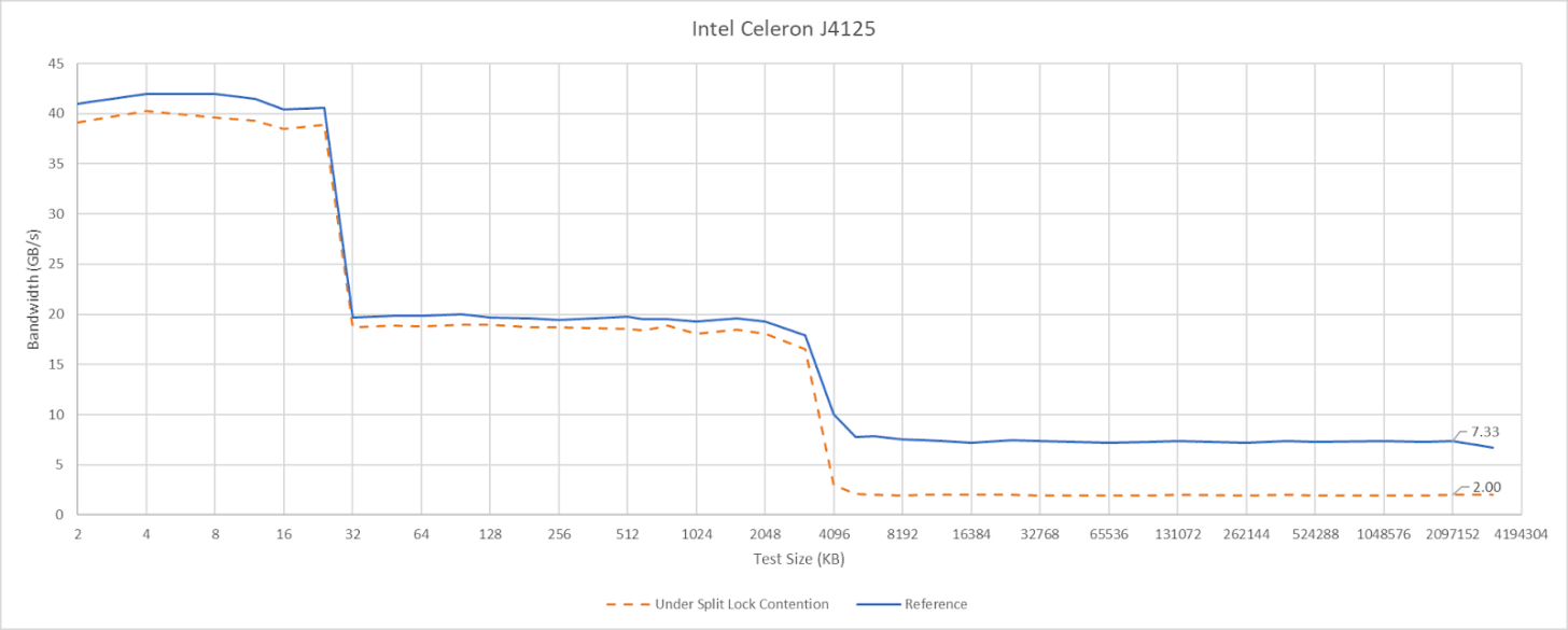 Split locks don’t stop other cores from running code. They’re not the hardware equivalent of Python’s global interpreter lock, or another similar construct that blocks concurrency. On modern CPUs, split locks don’t even block all memory accesses. They only introduce a performance penalty when those memory accesses miss a certain cache level. That performance penalty varies wildly too.