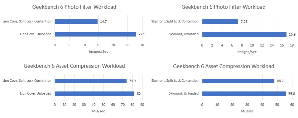 Geekbench 6’s photo filter and asset compression workloads barely show any performance loss, as foreshadowed by microbenchmark results. Alder Lake might have particularly poor split lock performance, but does an excellent job of insulating other applications from their effects.