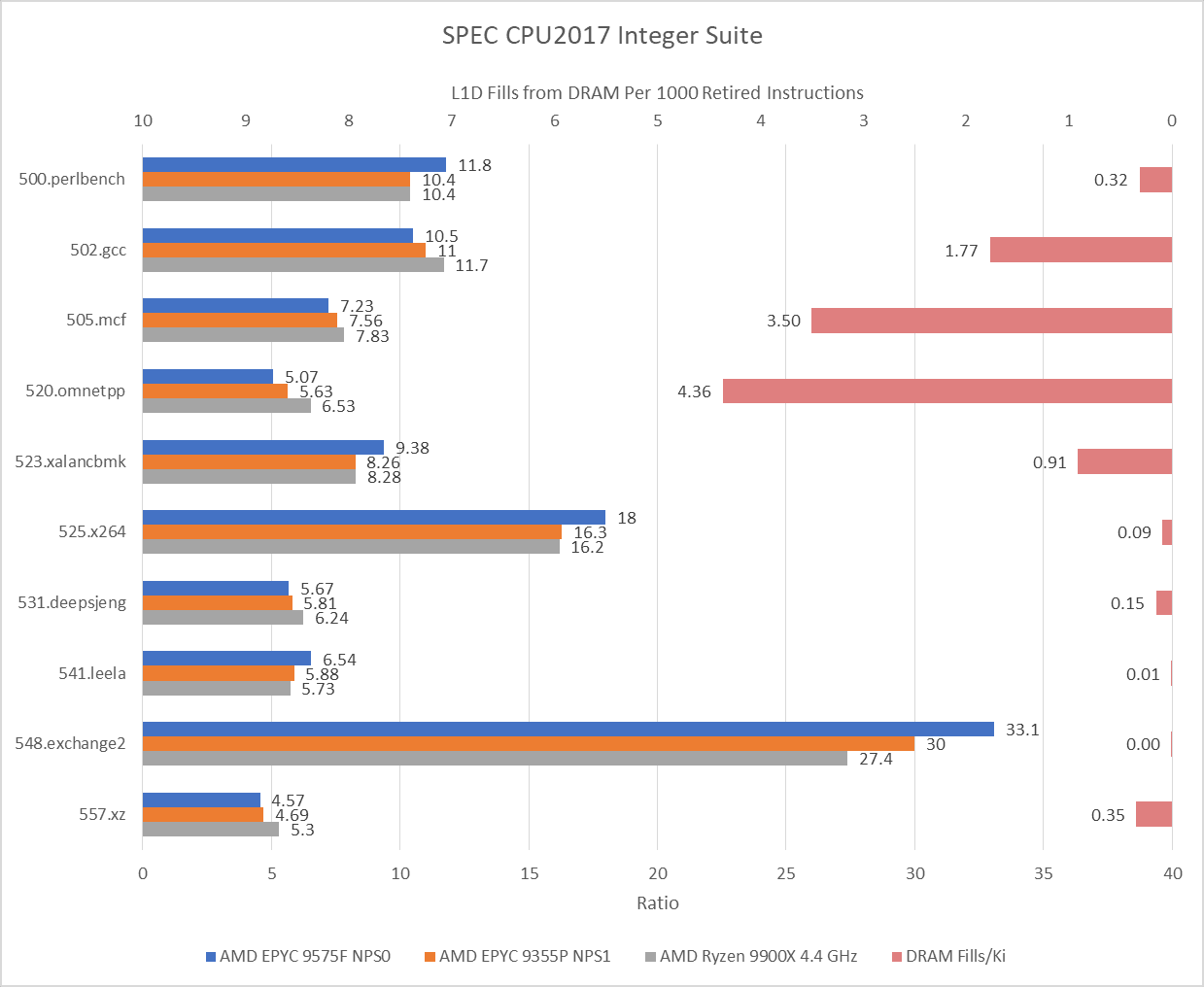 Individual workloads show a more complex picture. The EPYC 9575F does best when workloads don’t miss cache. Then, its high 5 GHz clock speed can shine. 548.exchange2 is an example. On the other hand, workloads that hit DRAM a lot suffer in NPS0 mode. 502.gcc, 505.mcf, and 520.omnetpp see the EPYC 9575F’s higher clock speed count for nothing, and the higher clocked chip underperforms compared to 4.4 GHz setups with lower DRAM latency.