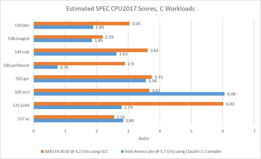CCC, or Claudes’ C Compiler, is a “from-scratch optimizing compiler with no dependencies […] able to compile the Linux kernel.” Anthropic used their Claude large language model (LLM) to write the entire compiler. Human effort was relegated to prompting and maintaining AI coding agents, and standing up a very robust test suite to keep those coding agents on track. Past Chips and Cheese articles used microbenchmarks and benchmarks built using GCC. GCC was developed by humans, which is backwards and reactionary by the standards of many cadres today. Comparing GCC and CCC should be a powerful showcase of revolutionary software development practices.