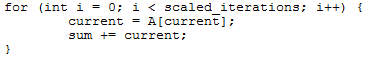 A = A[current] creates a dependency chain where one array access result feeds into the next, preventing accesses from overlapping even on an out-of-order core. Dividing access time by iteration count gives latency. CCC and GCC compile the loop into the following assembly code:
