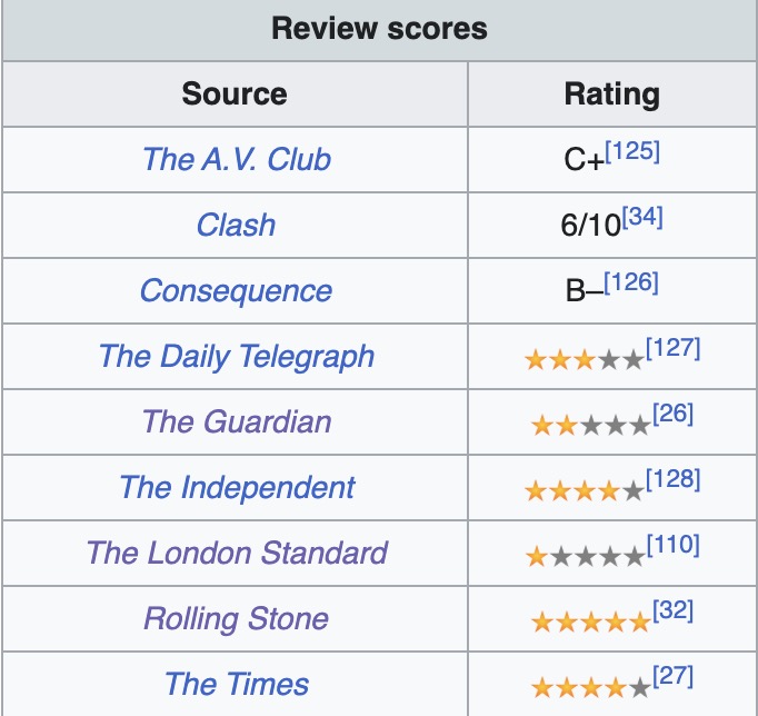 值得一提的是,The London Standard 只是英国的新闻媒体,撰稿人是记者,Rolling Stone 则是一开始就专注音乐和流行文化的杂志。前者能反映大多数普通听众的想法,而后者则更能反映音乐行业的观点。此外,我只取了两个极端的评价,其他媒体的评价相对保守,但整体上的确是褒贬不一。