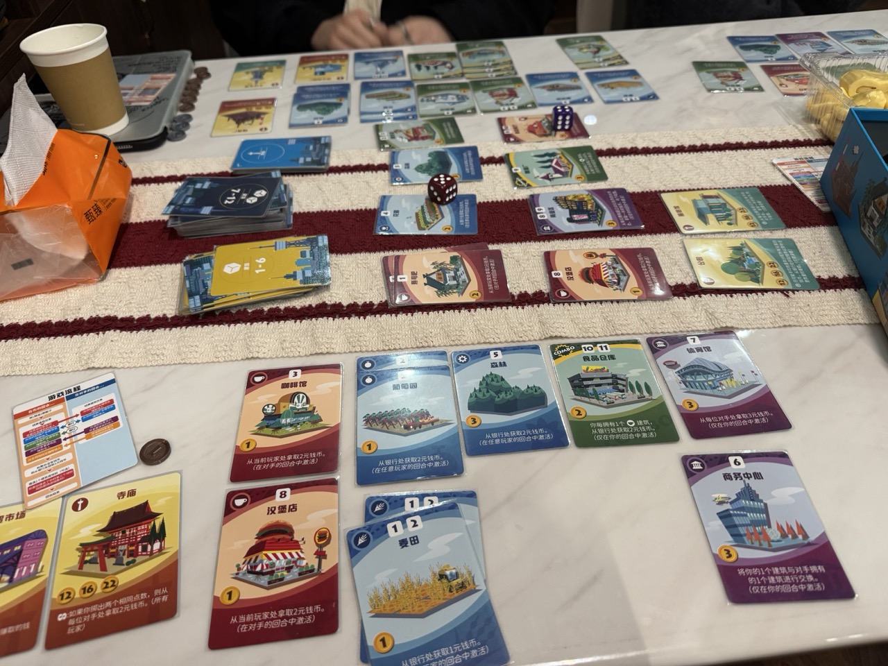 第一个桌游叫《骰子小镇 2》,卡牌构筑的玩法,花费金币建造建筑,每轮行动时玩家要掷骰子,骰子的点数可以触发建筑的效果,效果大部分是产生金币、从其他玩家那里拿取金币。游戏胜利的条件是建造三个昂贵的地标建筑,先建造完地标的玩家获胜。整理而言是比较轻松愉快的游戏,竞争元素不大,刚入门的桌游玩家也能玩得很开心。