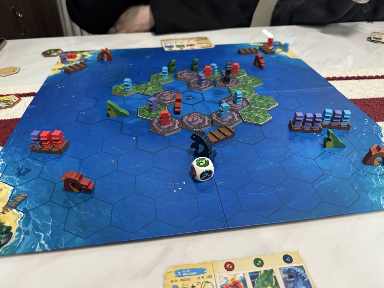 第二个游戏我记不清名字了,包装盒上写的好像是 Survive the island 之类的。每个玩家选择一个颜色的小人,轮流把它们摆放在岛屿上,游戏的目的是从岛屿上救回尽可能多的小人到岸上,同时也可以阻止其他玩家救援。每个小人有不同的分数,开始前可以记忆自己把高分的小人放到了哪里,但是游戏正式开始之后就不行了。每轮玩家行动时有三个操作:一、分配三次步数,移动小人或船只,同时可以使用技能卡;二、拆掉一个沿海地块模拟岛屿沉没的过程,拆掉的地砖可能会生成怪物、船只,也可能成为技能卡收入囊中;三、投掷一次怪物骰子,移动对应颜色的海怪,可以将怪物放得离自己的小人远一点,也可以去陷害别人。这应该是三个里面我最喜欢的游戏。