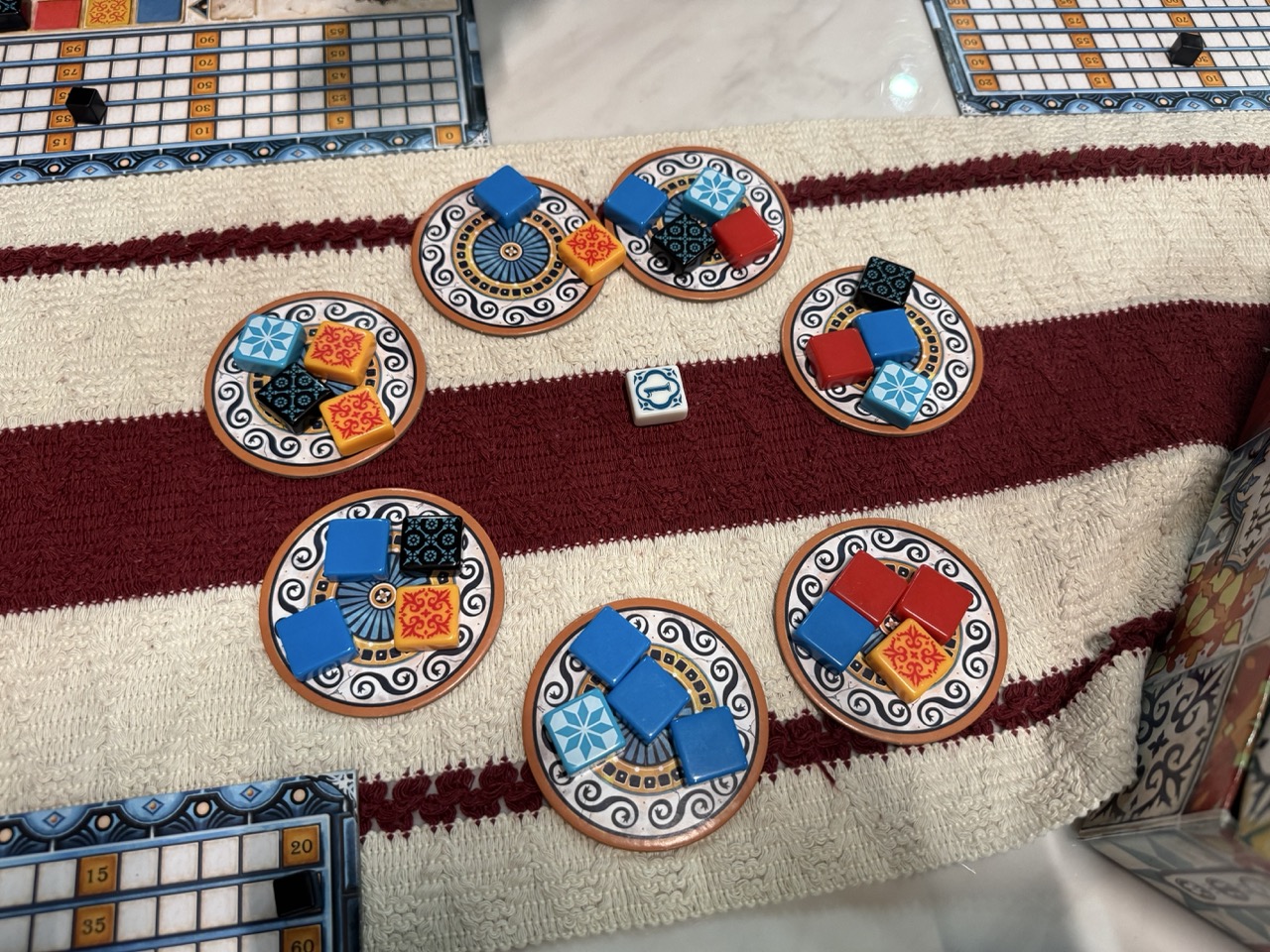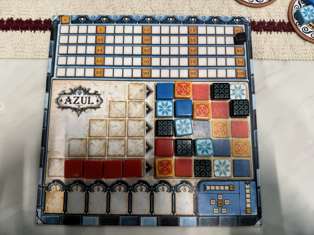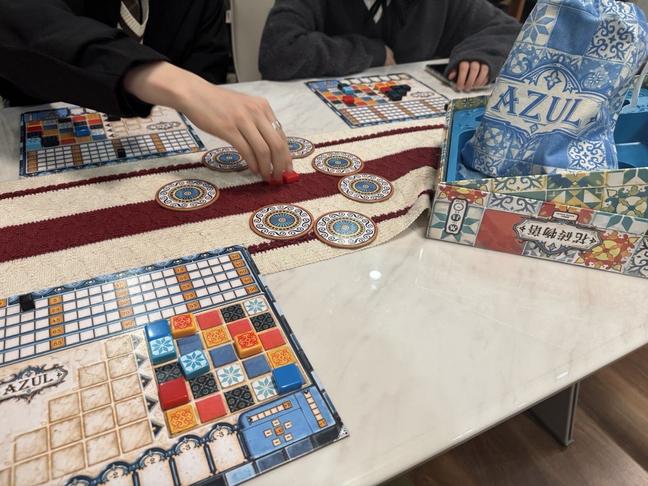 最后一个是花砖物语(原名 Azul,BoardGameGeek 上有 这个游戏的页面 ),玩法和记分规则都有些复杂,玩了一轮之后才搞懂,这里就不赘述了。大概得玩法是每个人轮流按照规则拿取砖块,场上的砖块拿完之后开始放置砖块并计分,根据临近的砖块数量和摆放方式,分数会有所不同,有一位玩家放满了一行游戏就结束了——不过我们搞错了规则,几乎是每个人都要放满了才结束的。其实是很有意思的玩法设计,多玩几轮之后大概就能体会到爽点了。