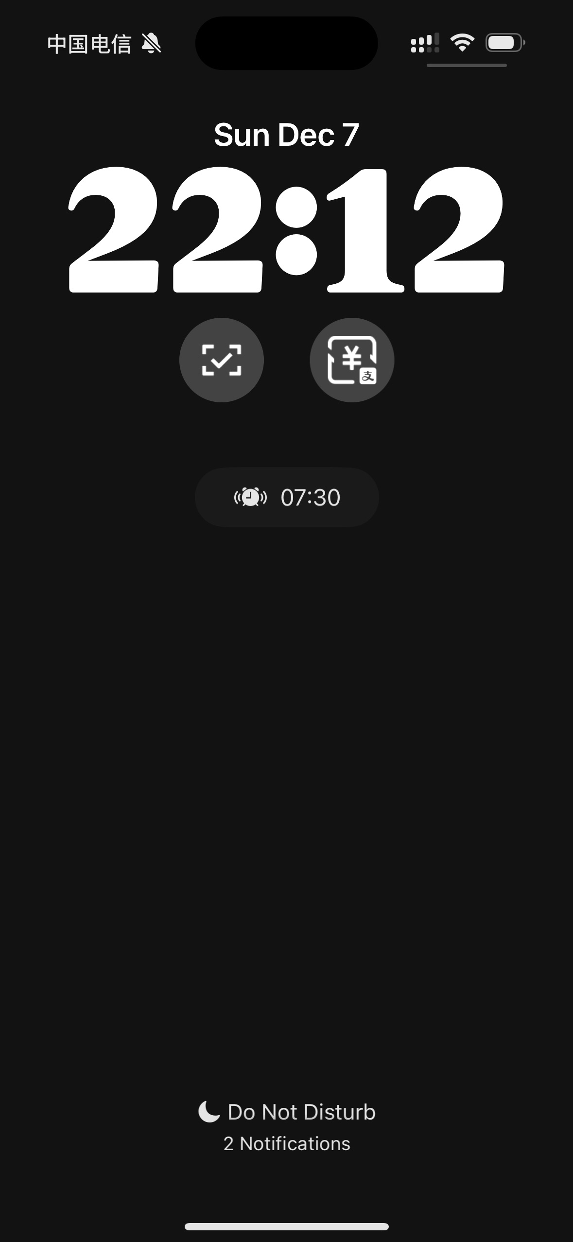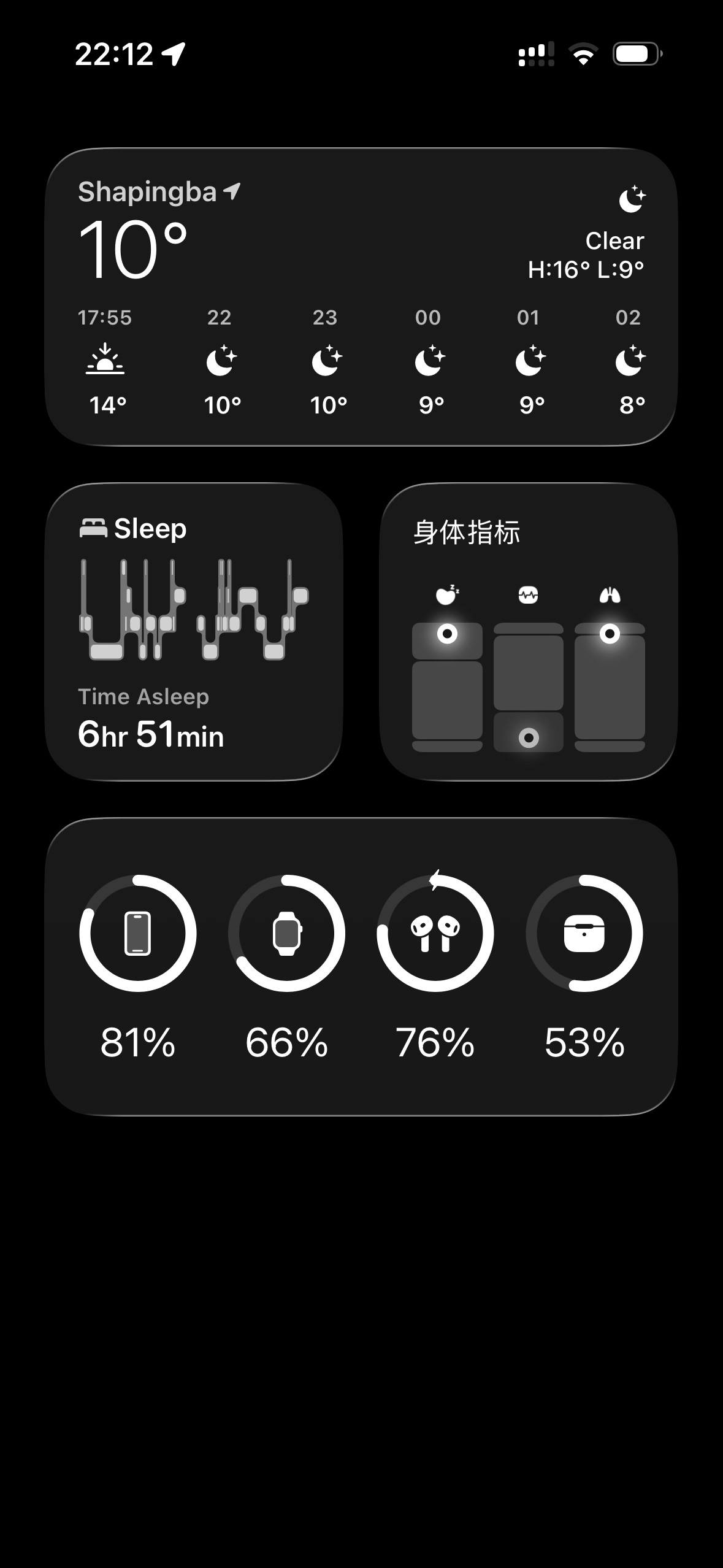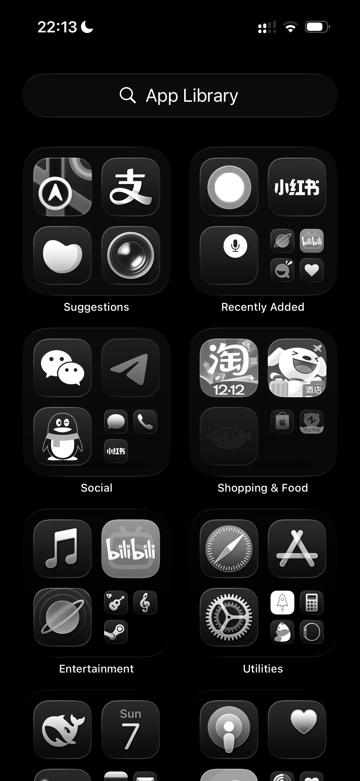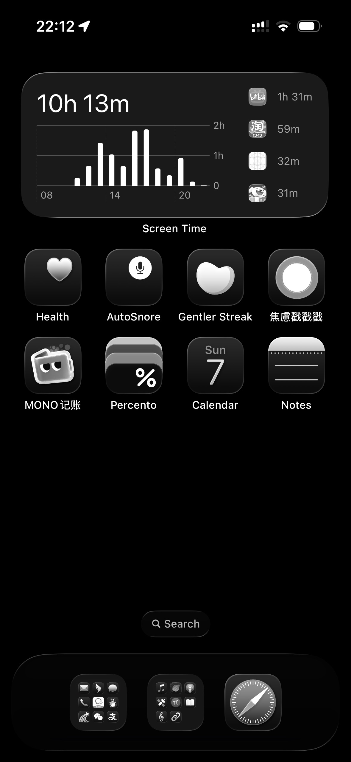 本来想换一个手机壁纸,打开设置界面的时候觉得选图太麻烦了,仔细一下自己很少有正事需要在手机上完成,不需要用好看的壁纸来提供情绪价值,于是我直接改成了黑色背景,顺便调整了主屏幕的布局,把不得不用的微信、钉钉之类的应用收进 Dock 栏的一个文件夹里,播客、音乐、RSS 阅读器等自己想看的信息源放进另一个文件夹,主屏幕上最显眼的位置放上当天的屏幕使用时间统计、一些健康和运动相关的 App 以及必要的记账、日历、备忘录等工具。图表也顺带调成了透明的玻璃样式,失去色彩之后,应用图标也就失去了一定的吸引力。