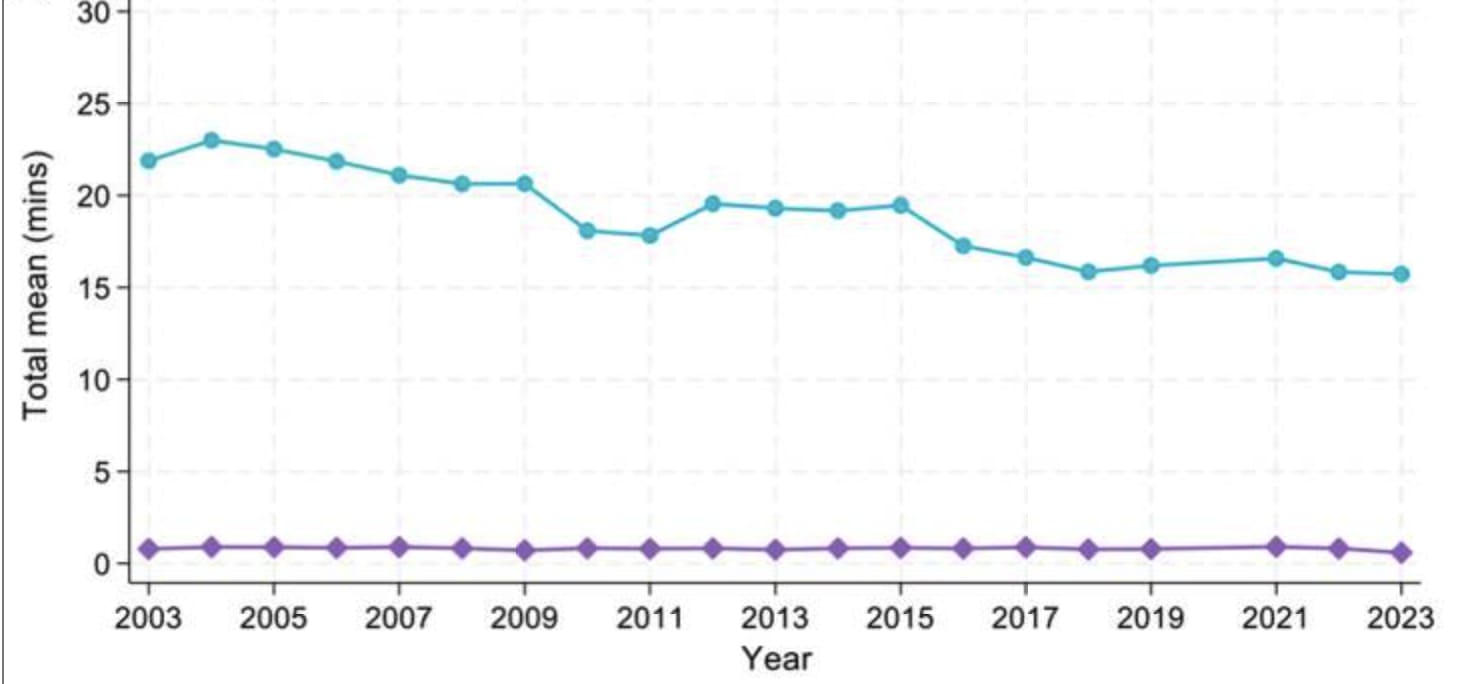 And the American Time Use Survey shows a dip in reading time from 2003 to 2023: