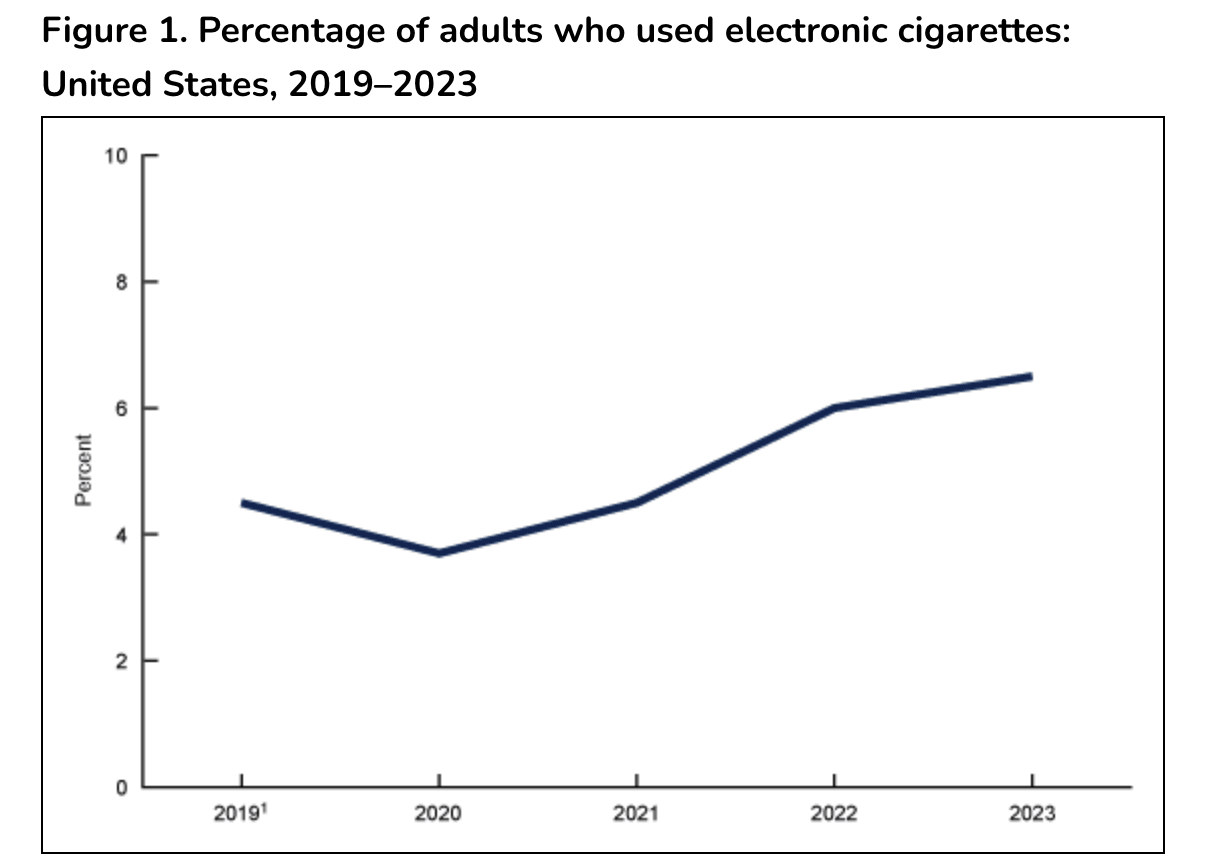 In case you’re wondering, the decline in smoking has not been offset by an increase in vaping. While adults vape a tiny bit more today than they did in 2019, the difference is very small: