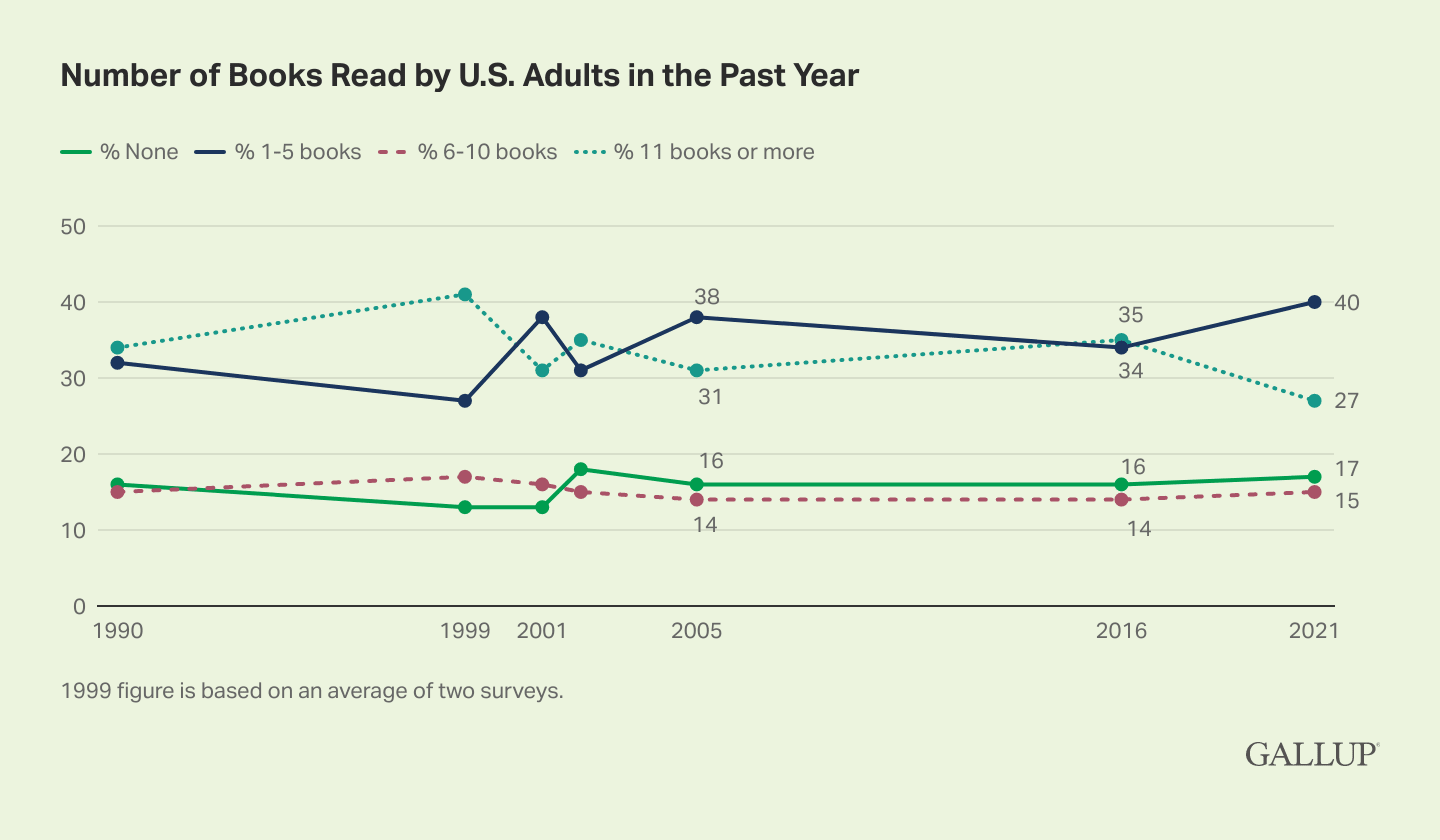 The actual data on reading isn’t as apocalyptic as the headlines imply. Gallup surveys suggest that some mega-readers (11+ books per year) have become moderate readers (1-5 books per year), but they don’t find any other major trends over the past three decades: