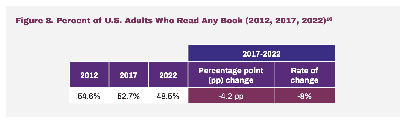 Other surveys document similarly moderate declines. For instance, data from the National Endowment for the Arts finds a slight decrease in reading over the past decade: