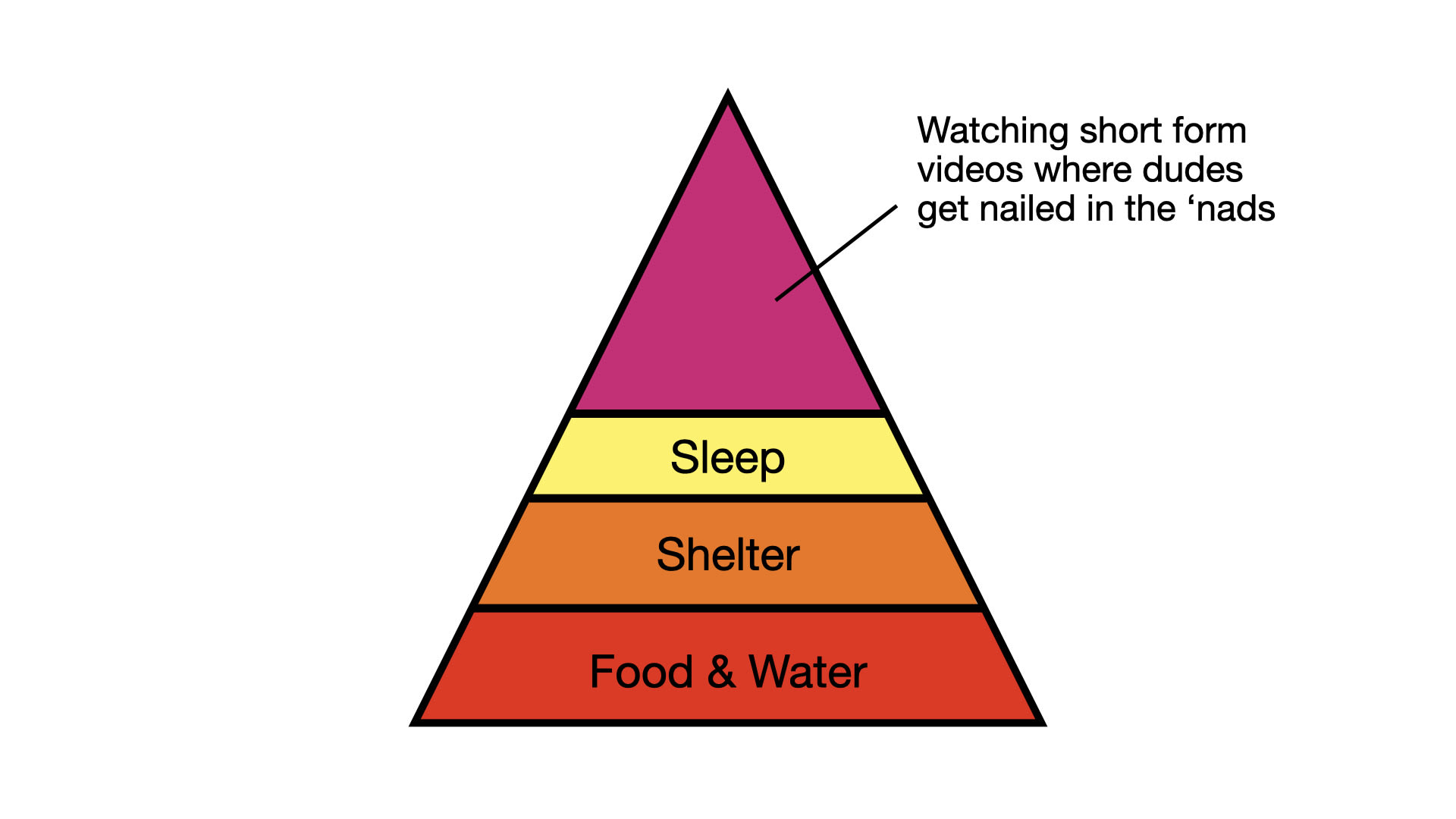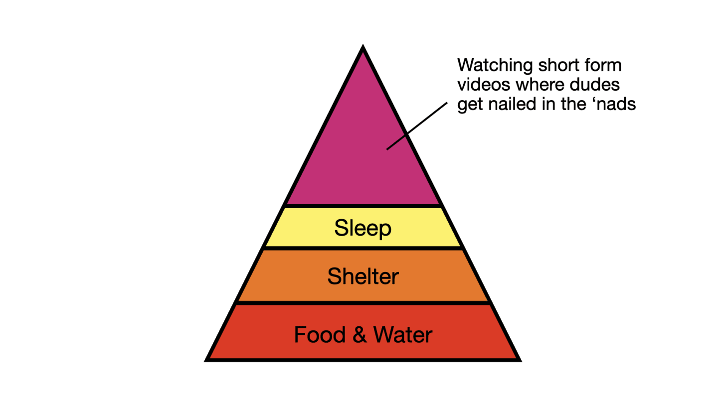 That’s why I doubt the core assumption of the “death of reading” hypothesis. The theory heavily implies that people who would once have been avid readers are now glassy-eyed doomscrollers because that is, in fact, what they always wanted to be. They never appreciated the life of the mind. They were just filling time with great works of literature until TikTok came along. The unspoken assumption is that most humans, other than a few rare intellectuals, have a hierarchy of needs that looks like this: