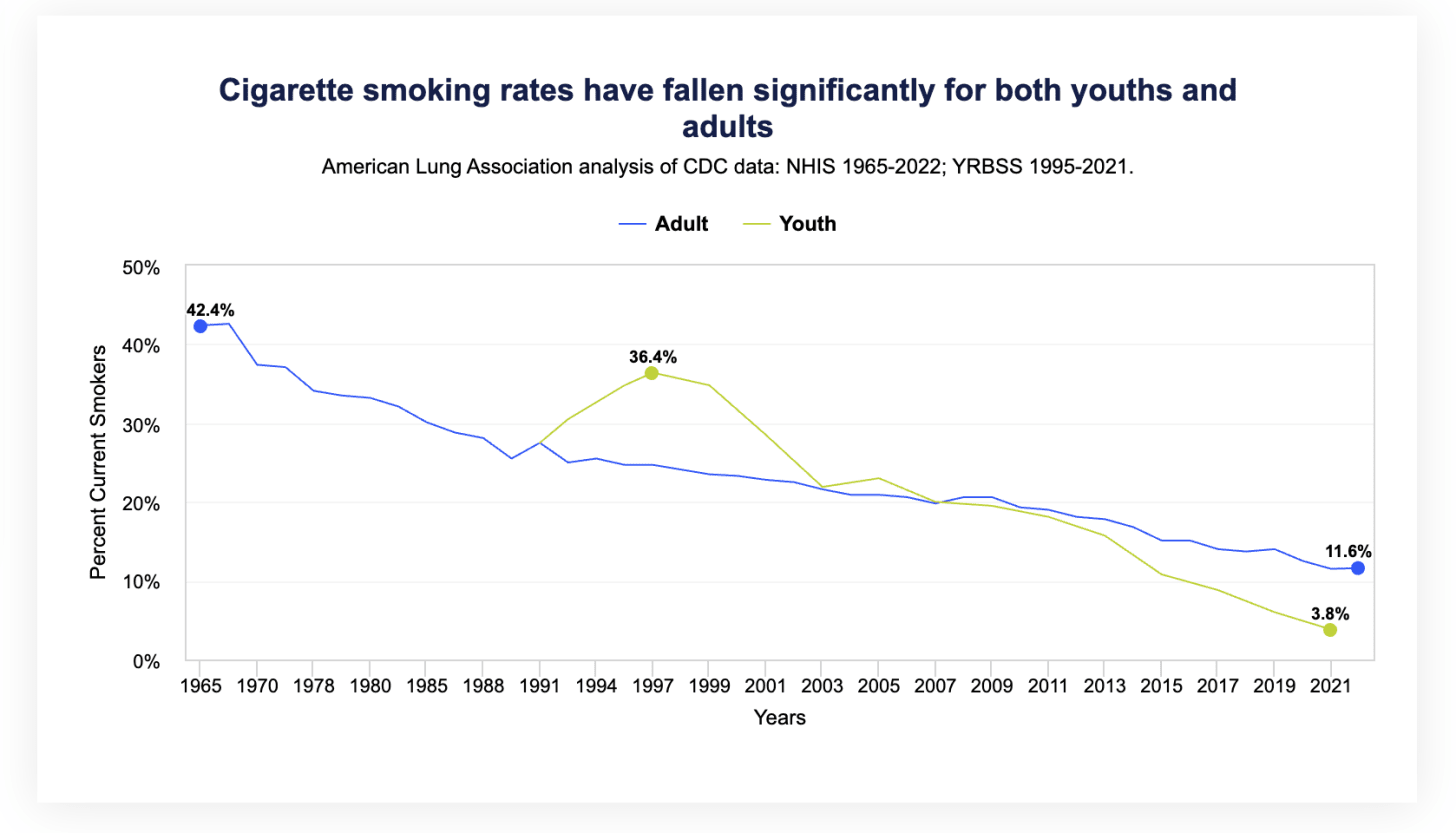 By the way, here is the actual data on cigarette smoking, via the American Lung Association: